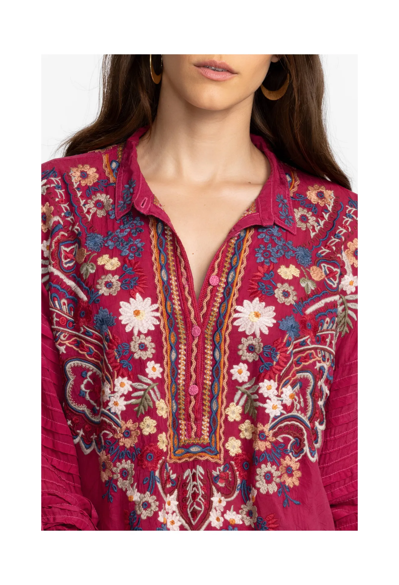 A Bountiful Display Of Color And Pattern, The Aubrette Blouse Embodies A Joyful Charm Thanks To Its Pretty Floral Motifs And Playful Design Details. Crafted From A Lightweight Fabric, This Blouse Features A Collar, A Front Button Placket, Long Sleeves, A Detailed Floral Placement Embroidery, And A Scallop Hem. Wear This Blouse With Jeans And Gold-Tone Jewelry To Channel A Versatile Bohemian-Inspired Ensemble.