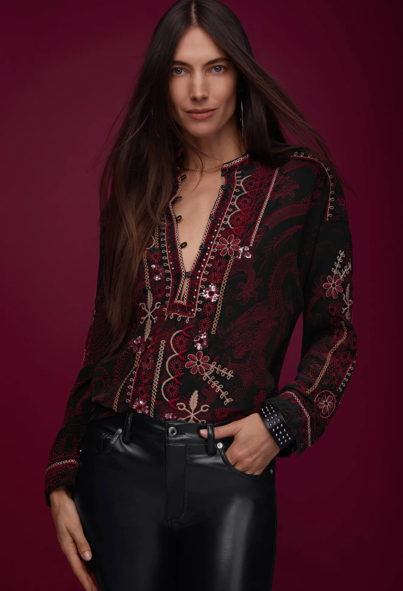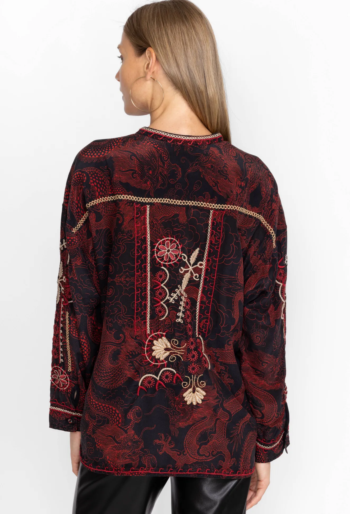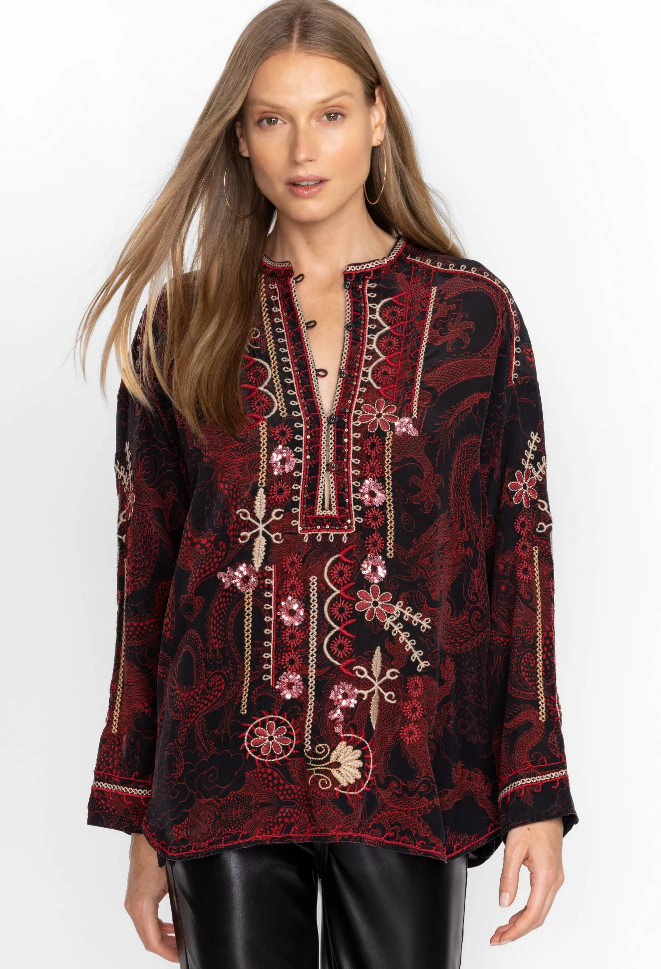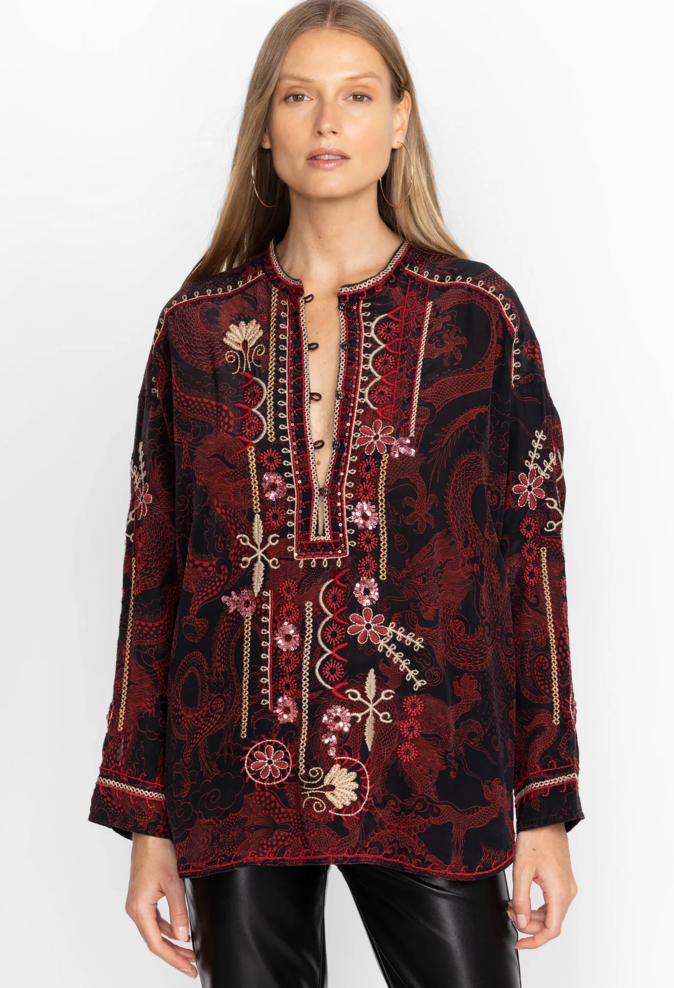 Ornately Detailed To Create An Elevated Style, The Belina Tunic Top Offers An Opulent Addition To Any Wardrobe. Crafted From 100% Silk And Adorned With Carefully Placed Embroidered Images, This Beautiful Tunic Features A Fabric Covered Button-Front And Cuffs. Pair With Flowing Trousers And Mule Flats For A Polished Timeless Look.