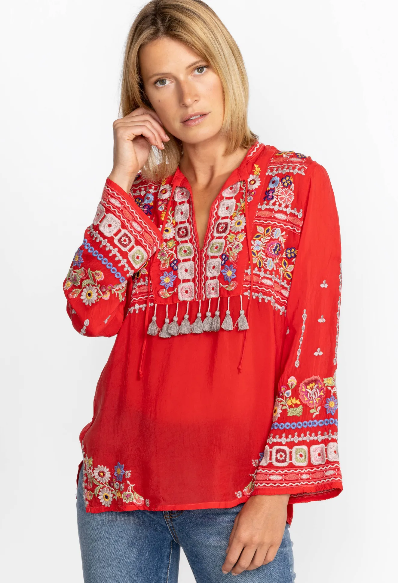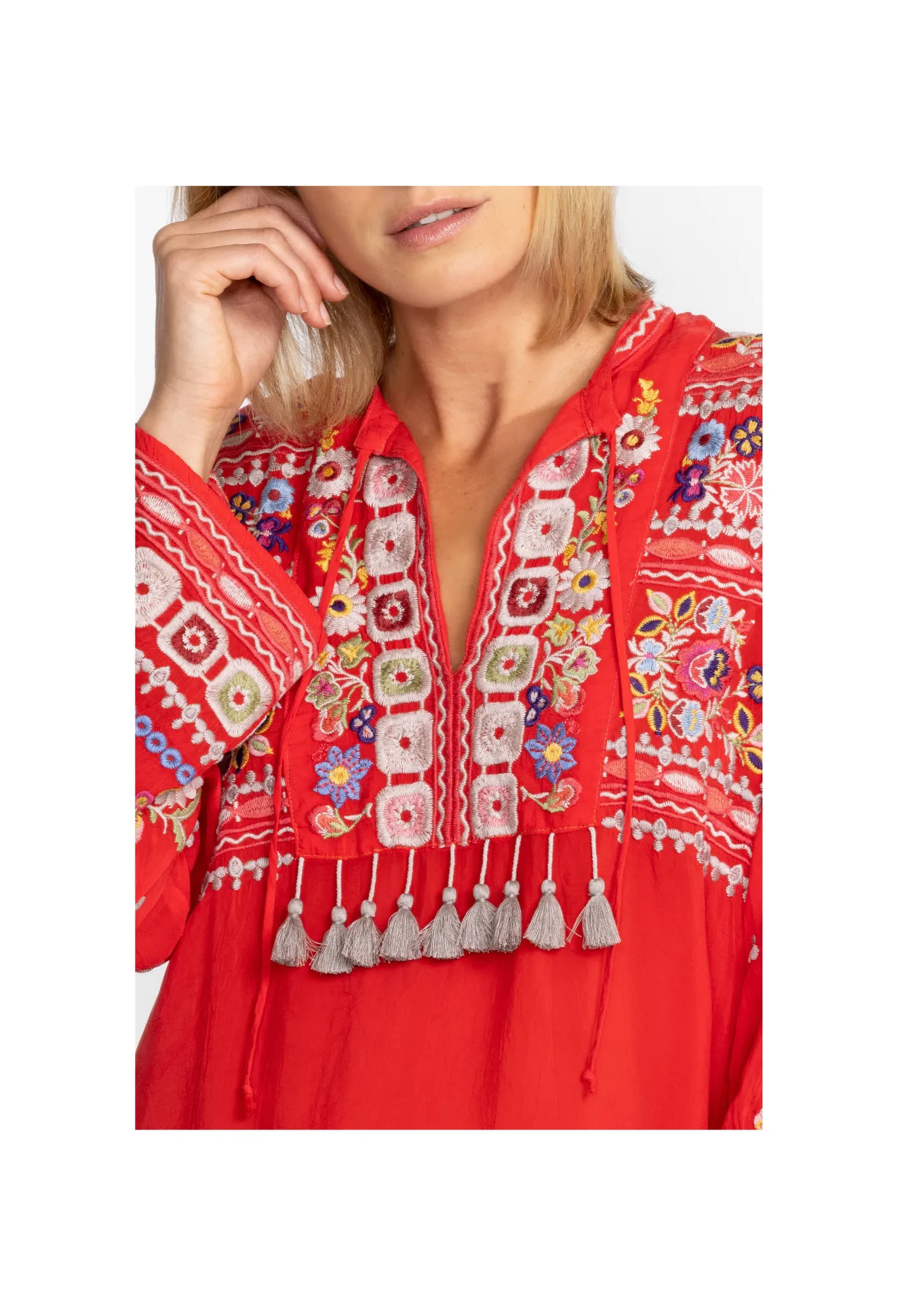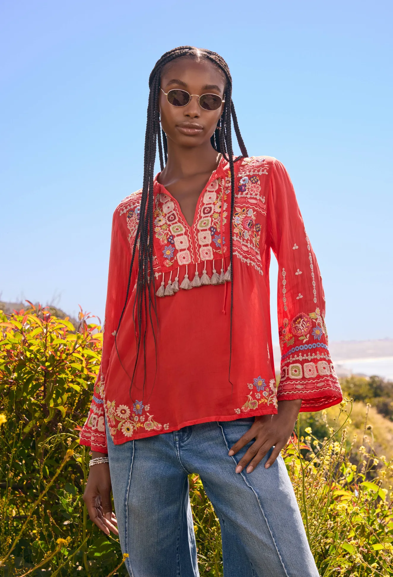 Crafted From A Lightweight Fabric, The Coriander Blouse Is Peppered With Eye-Catching Motifs. A Failsafe Choice For Day-To-Day Pursuits, This Blouse Boasts A Tie At The Neckline With Tassels, Long Sleeves, And A Detailed Placement Embroidery In Rich Shades. Opt For A Bohemian Look By Pairing This Blouse With Neutral Linens And Statement Jewelry.