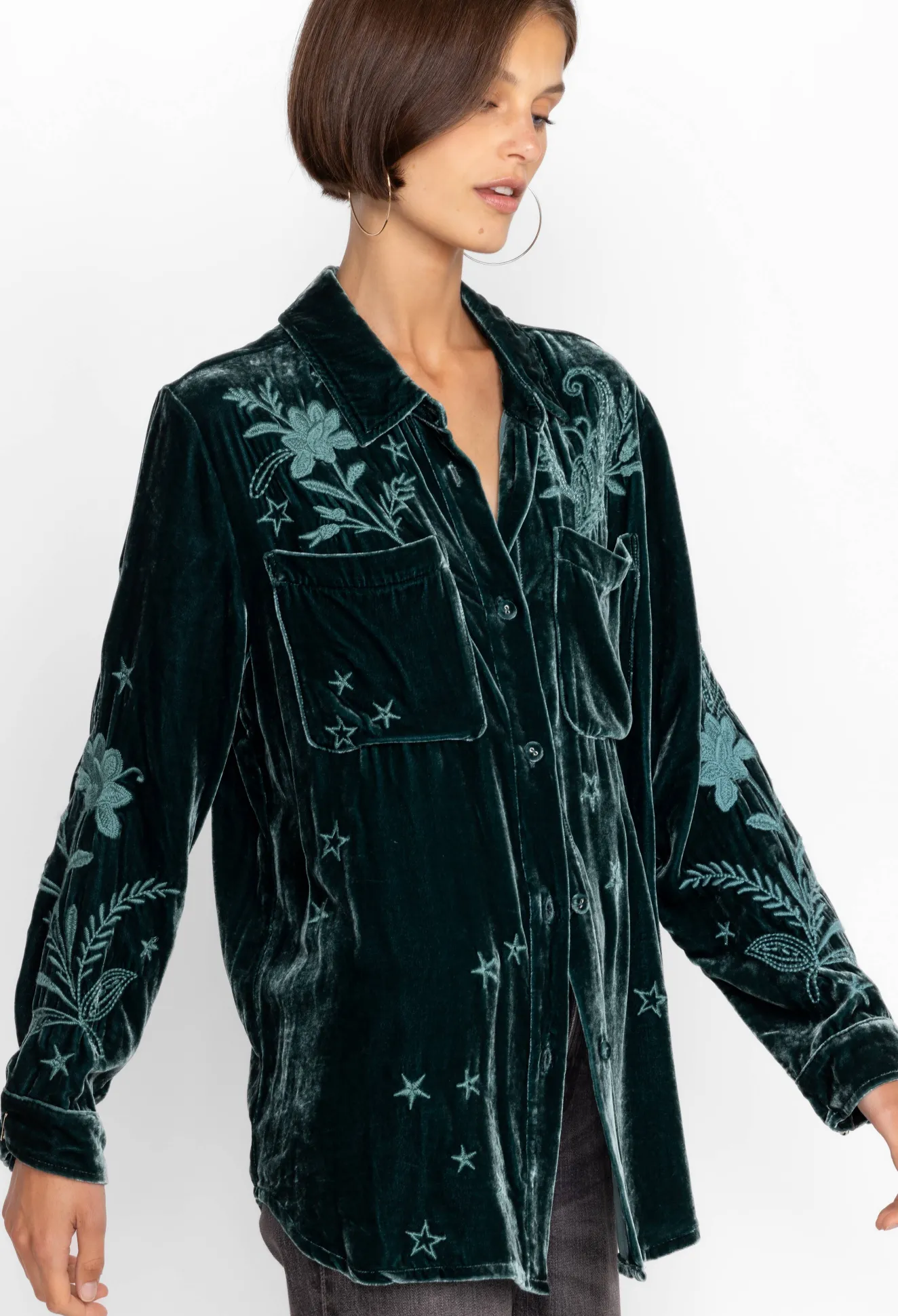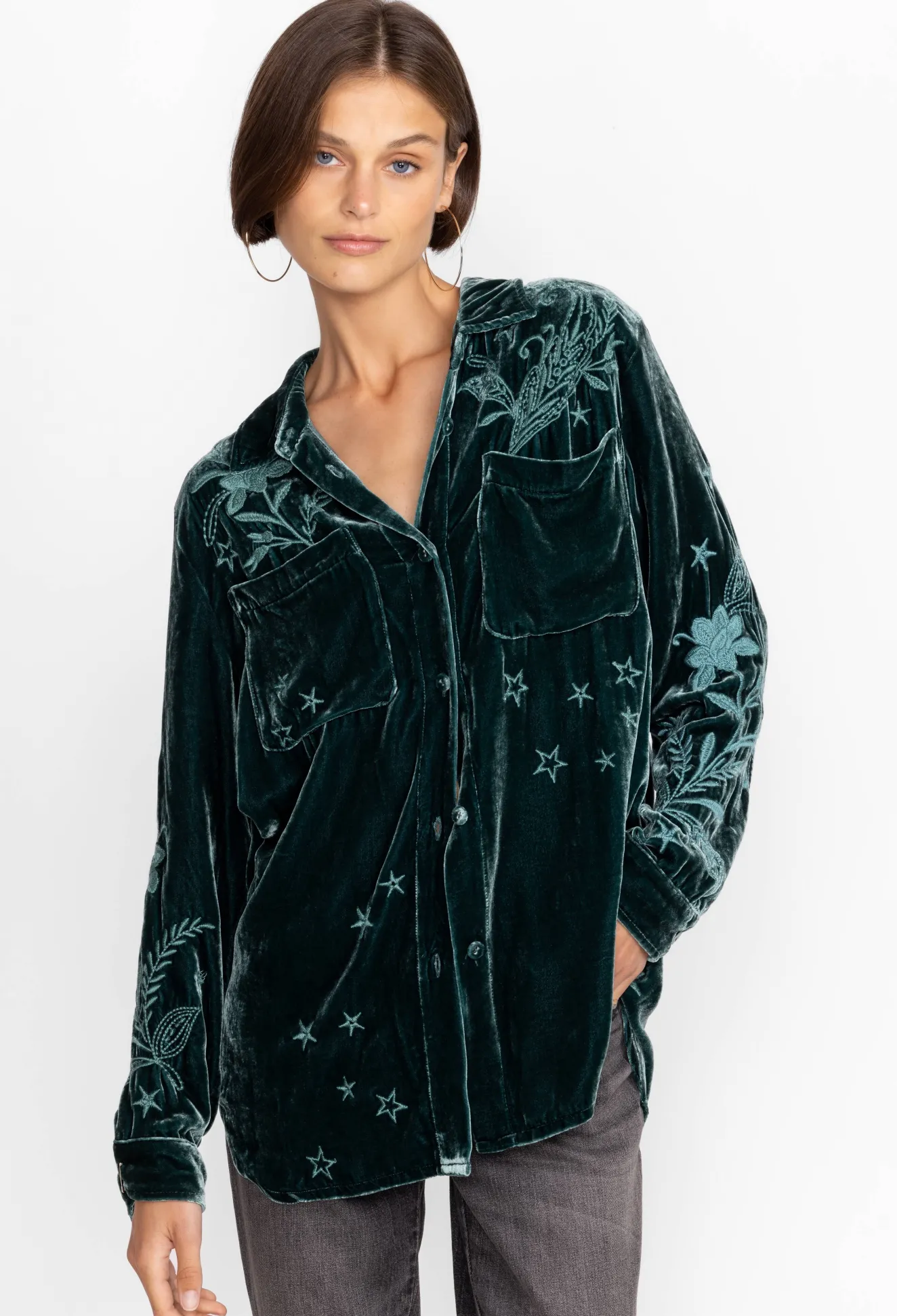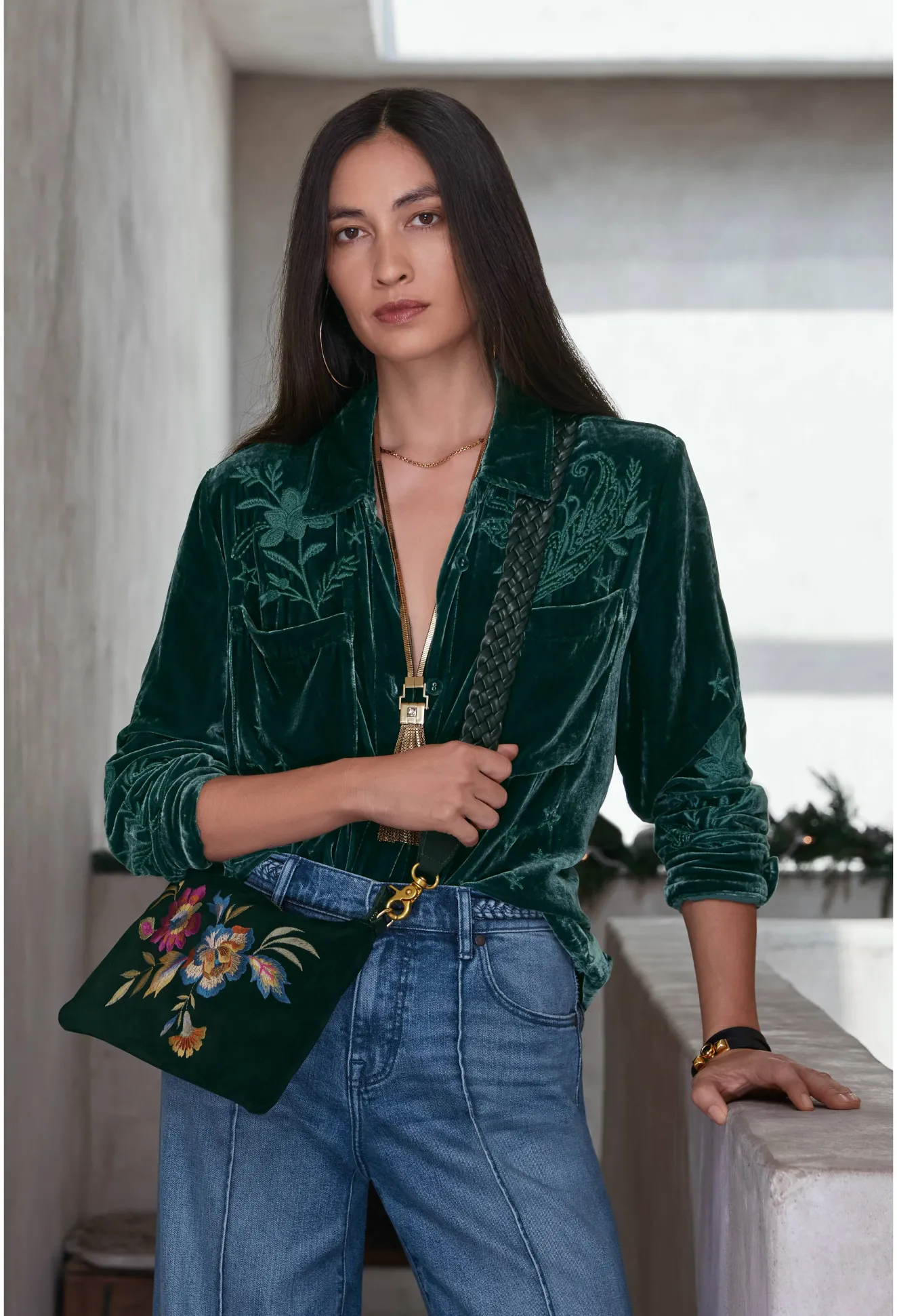 Emanating A Vintage Feel, The Frankie Velvet Chore Jacket Demonstrates A Passion For Detail. Imagined In A Green Colorway, This Jacket Is Made From Silk Blend Velvet And Features A Collar, A Front Button Closure, Long Sleeves, Patch Pockets, A Floral Placement Embroidery, And Fabric Covered Buttons. Wear This Jacket With A Tee And Jeans For A Stylish Yet Relaxed Wear-Anywhere Look.