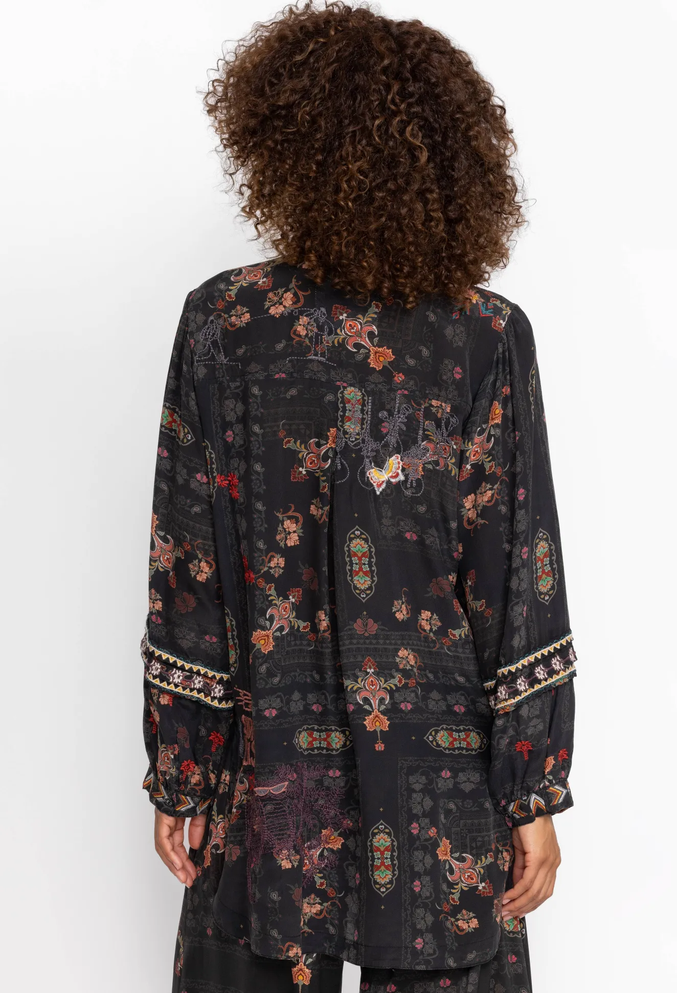 Crafted From 100% Sumptuous Silk, The Aggie Tunic Top Is An Exercise In Intricate Elegance. Ornately Detailed With Bursts Of Brilliant Floral Pattern, This Blouse Features Delicate Placement Embroidery And Carefully Constructed Fabric-Covered Buttons At Both The Front And At The Cuffs. Pair With Flowing Palazzo Pants For A Uniquely Bohemian Flair.