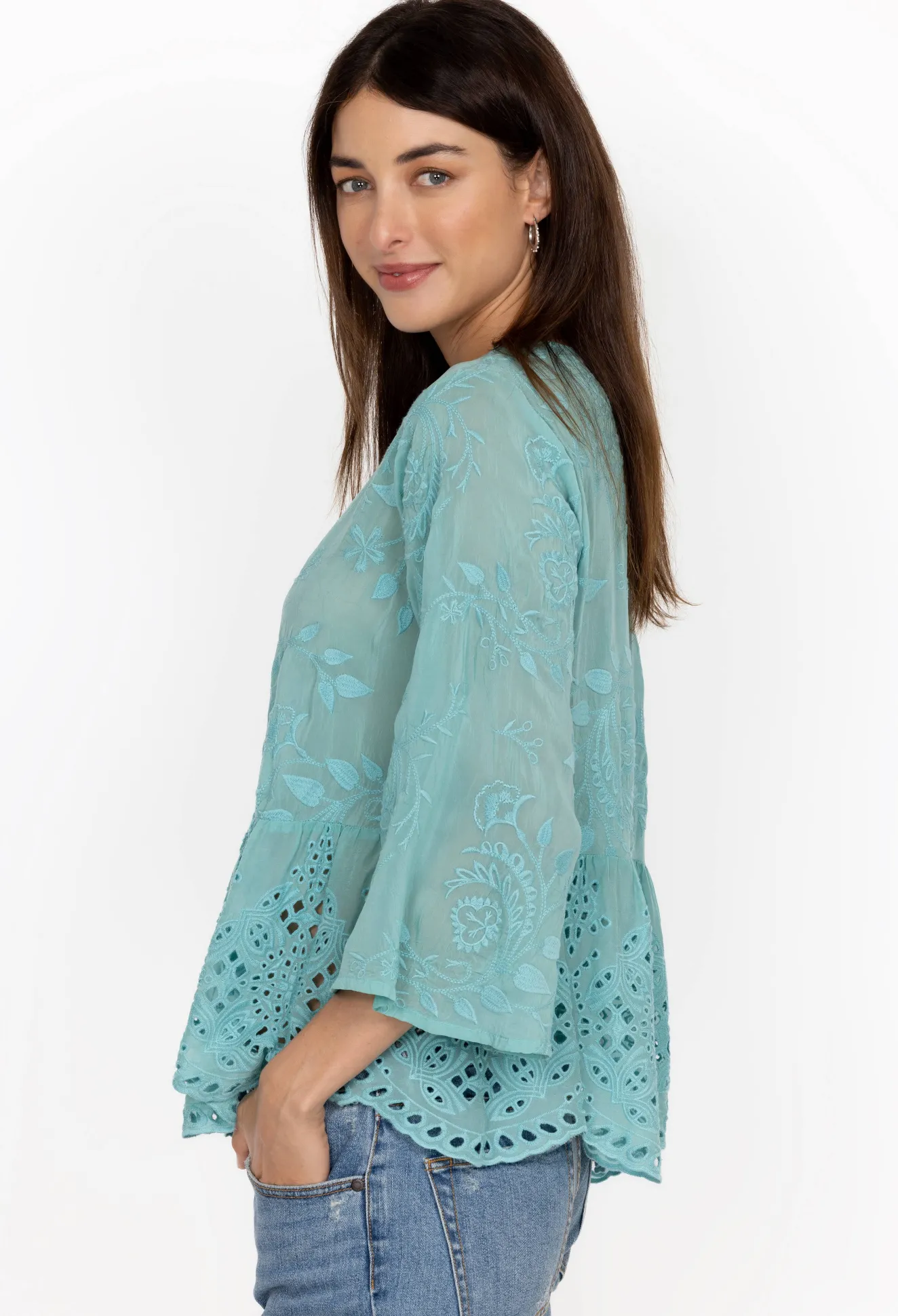 Distinctly Bohemian, The Ingrid Reveka Blouse Is Reminiscent Of Easy Days Meandering Through Flower-Dotted Fields. This Blouse Is Made From A Lightweight Material And Features A V-Neck, A Front Button Closure, Long Sleeves, A Subtle Floral Print, And A Scalloped, Tiered Hem With An Intricate Eyelet Embroidery. Pair With Jeans To Modernize The Look Or Pair With Wide-Leg Pants For A Breezy Daytime Ensemble.