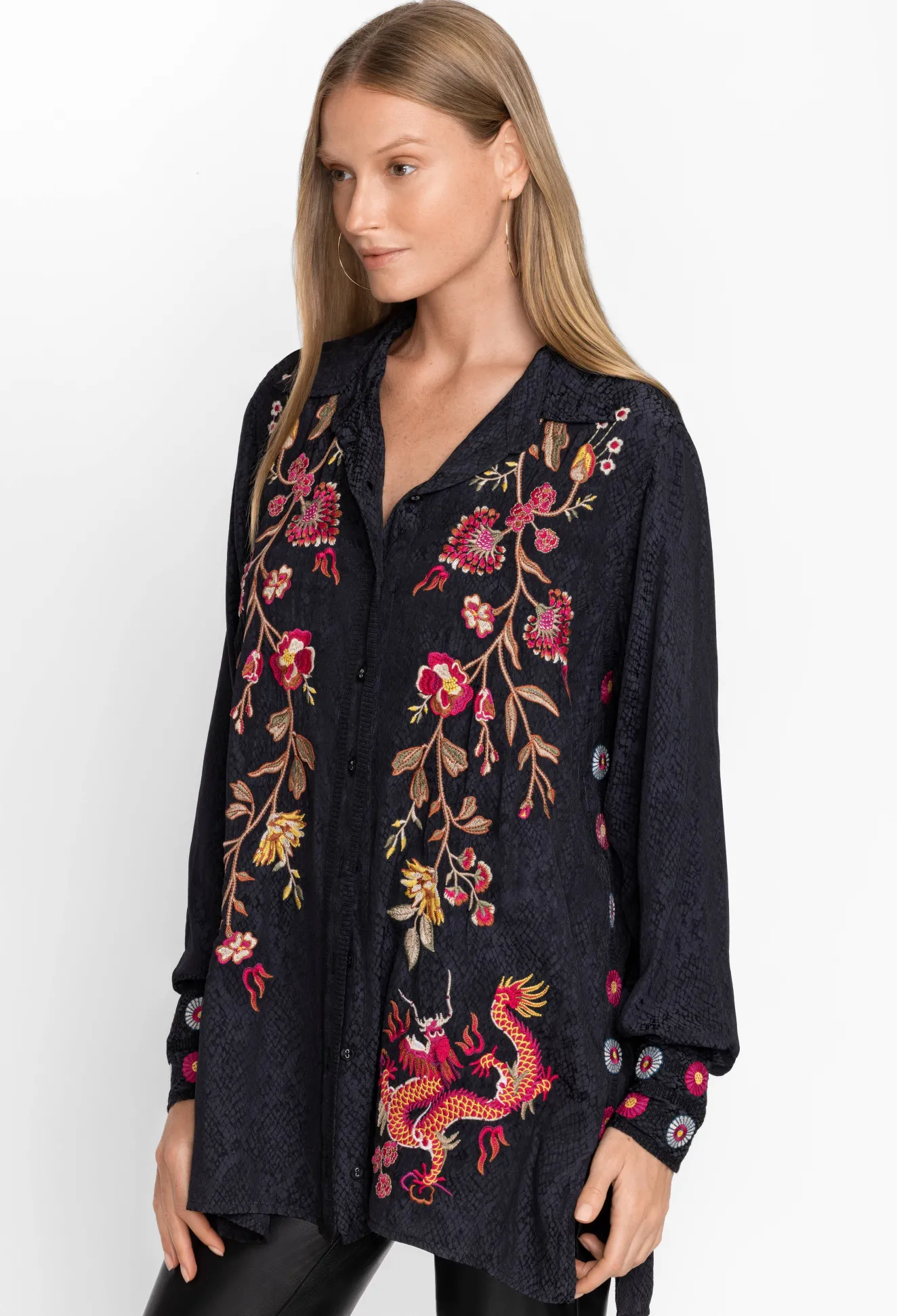 Made From A Comfortable, Lightweight Fabric, The Lilith High Slit Tunic Is The Height Of Classic Bohemian Style. Perfect For All Seasons, This Tunic Features Long Sleeves, A Button Front, A Collar, And An Intricate Placement Embroidery Consisting Of Elegant Blooms. For A Simple Everyday Ensemble, Pair This Tunic With Wide-Leg Pants And Flats.