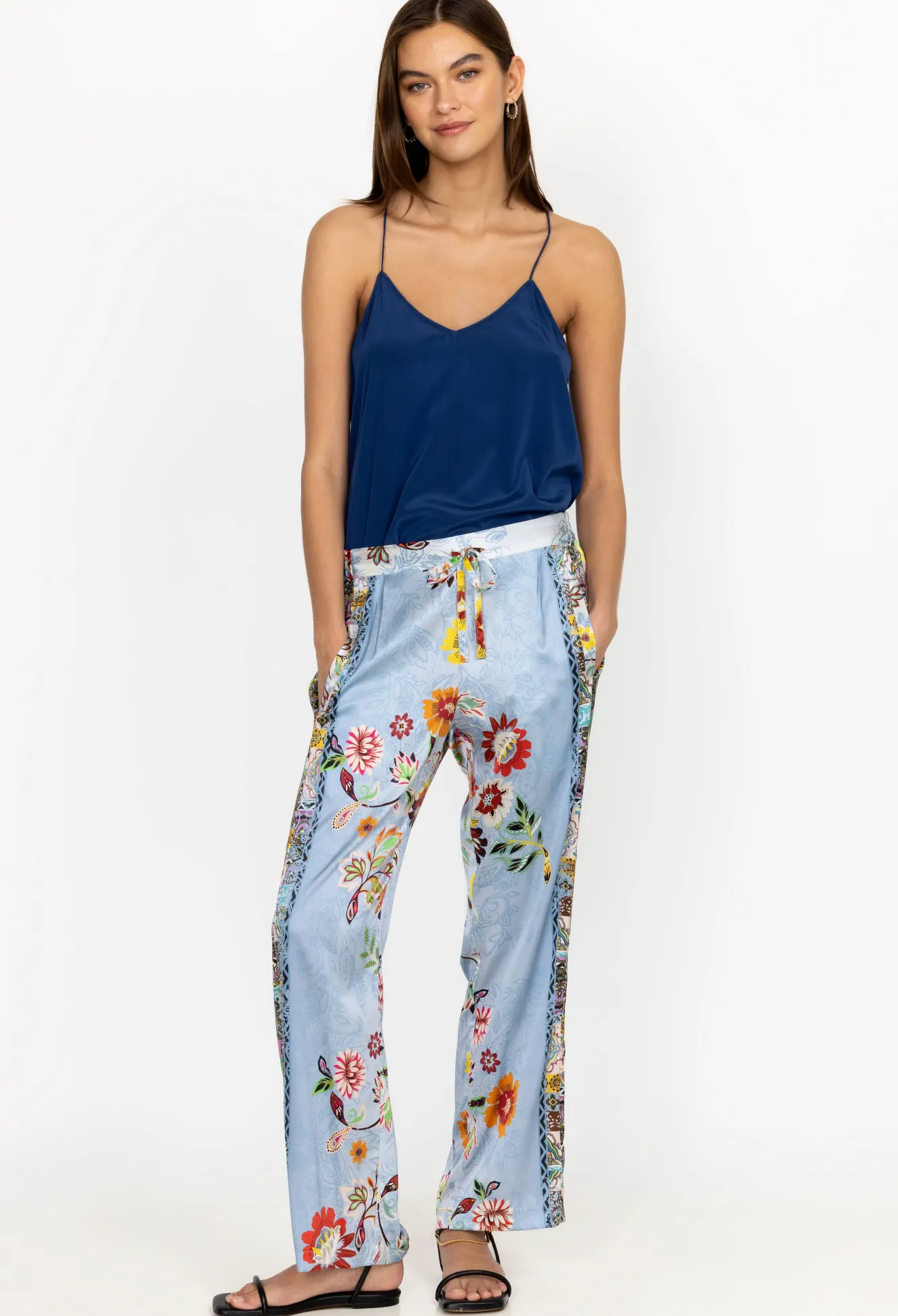 Igniting A Feeling Of Optimism, The Rainbow Liza Pants Add A Joyful Twist To A Versatile Silhouette. These Pants Are Designed From A Smooth Silk Blend And Feature An Elastic Drawstring Waist, Vibrant Florals, And A Straight Leg With Colorful Patterned Sides. Style With A Matching Printed Tunic For An Eclectic Look.