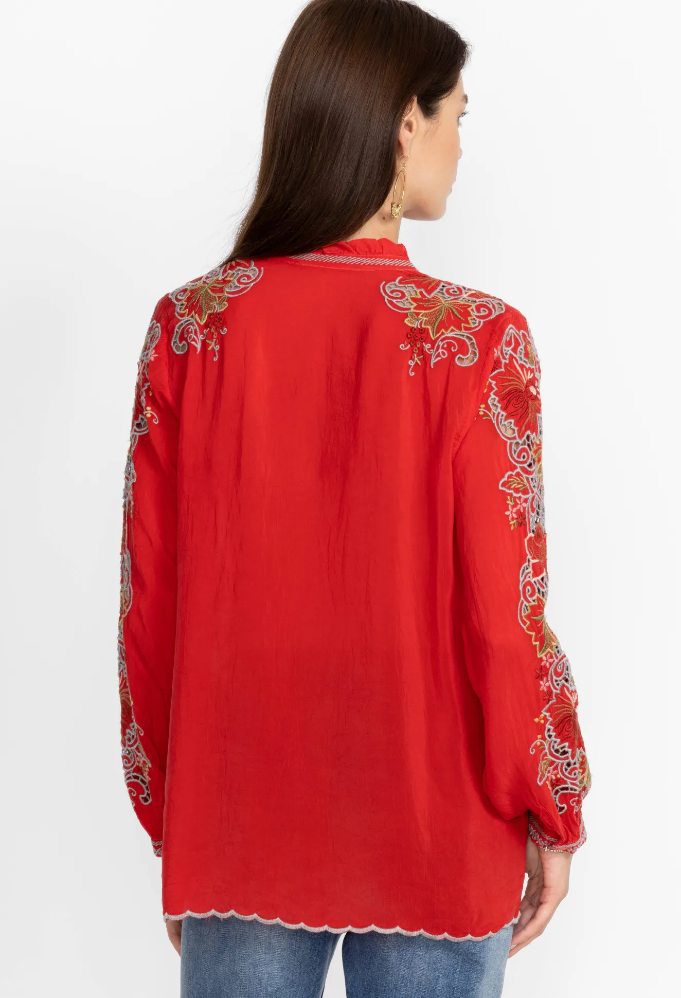 A Mesmerizing Take On A Timeless Wardrobe Silhouette, The Ruelle Blouse Effortlessly Combines Minimal Features With Fanciful Touches. This Blouse Is Crafted From A Lightweight Material And Boasts A Round Neck, Long Sleeves, A Colorful Floral Placement Embroidery, And A Scallop Hem For A Feminine Finish. Style This Blouse With Jeans During The Day And Switch To Tailored Pants In The Evening.