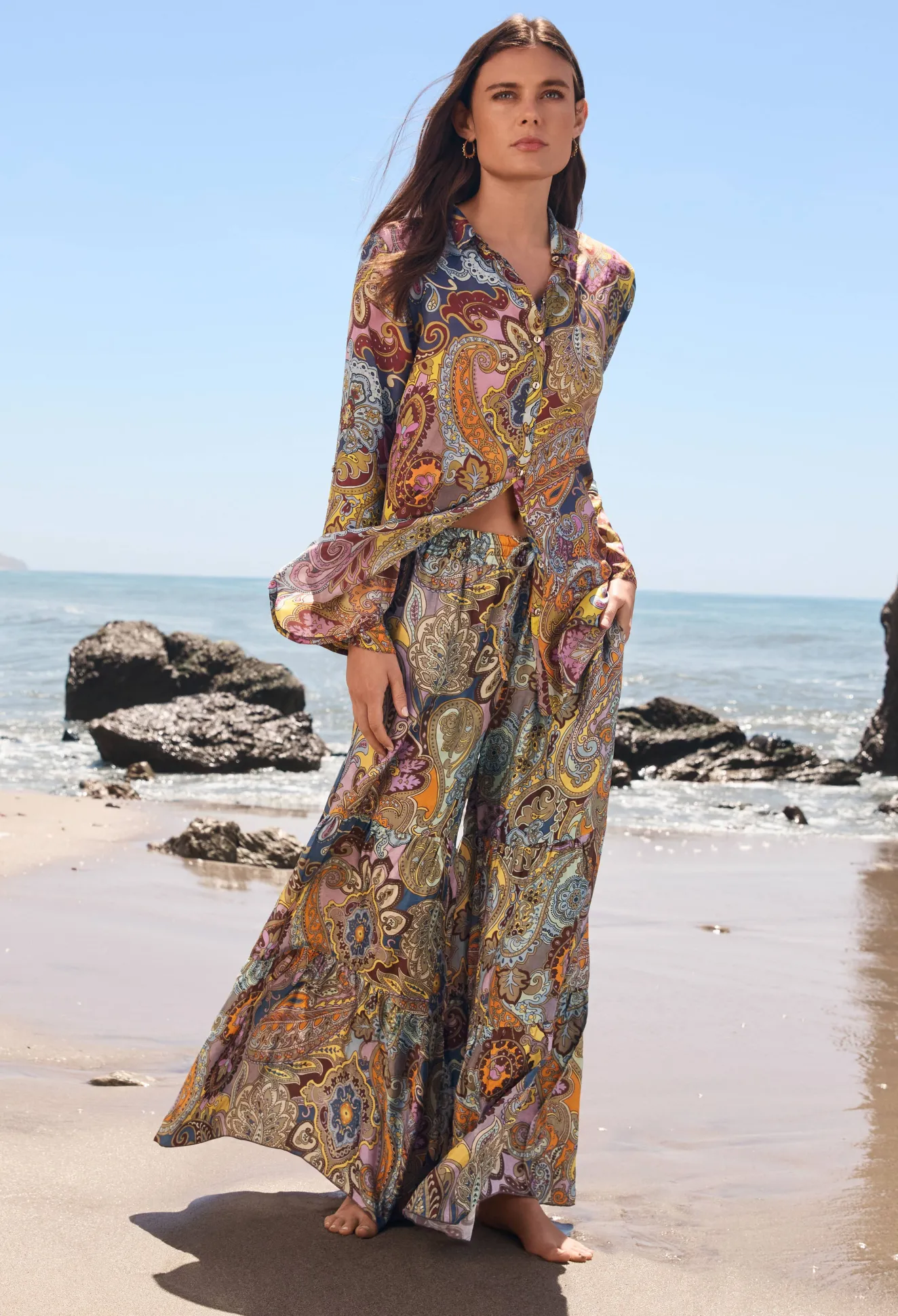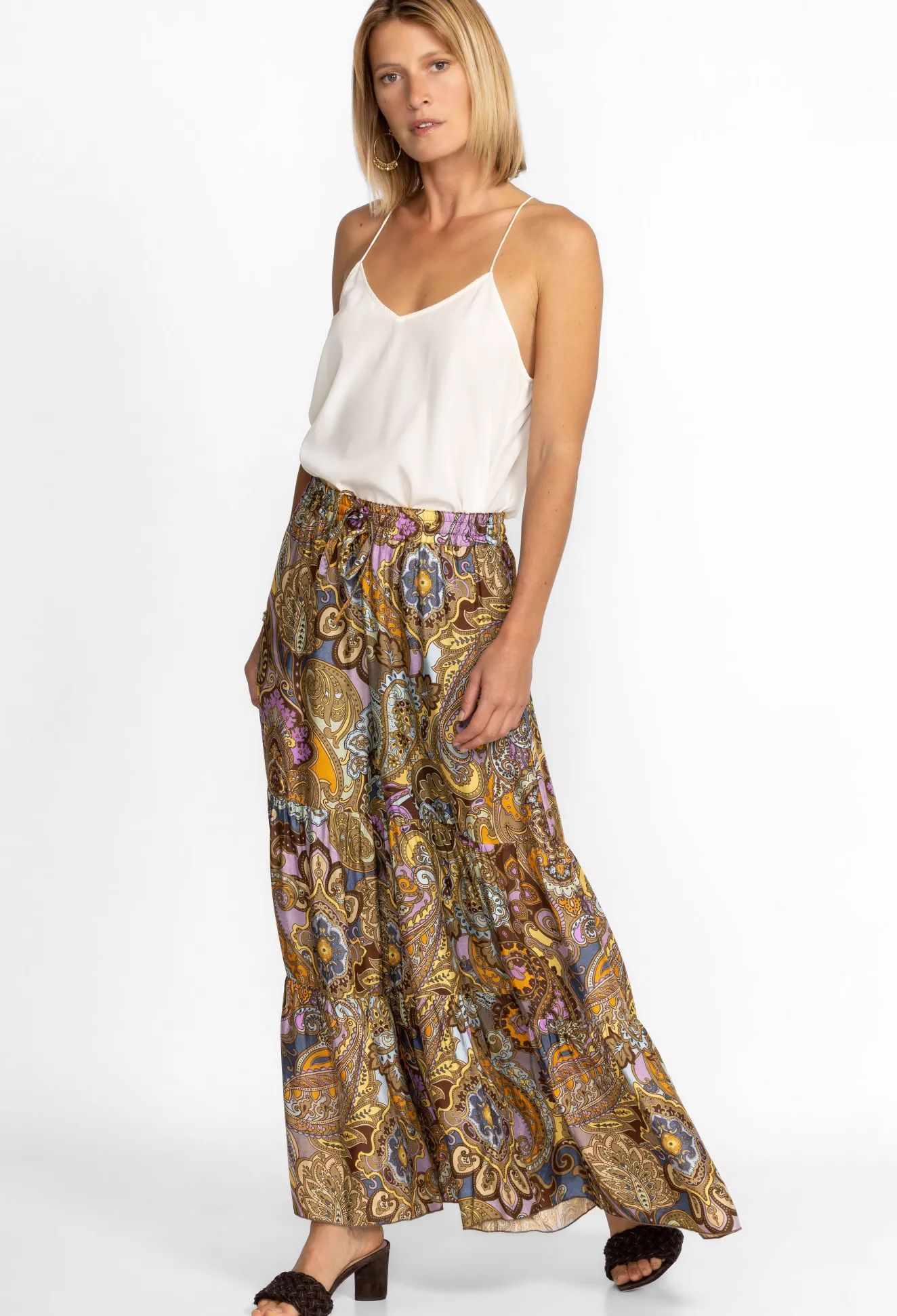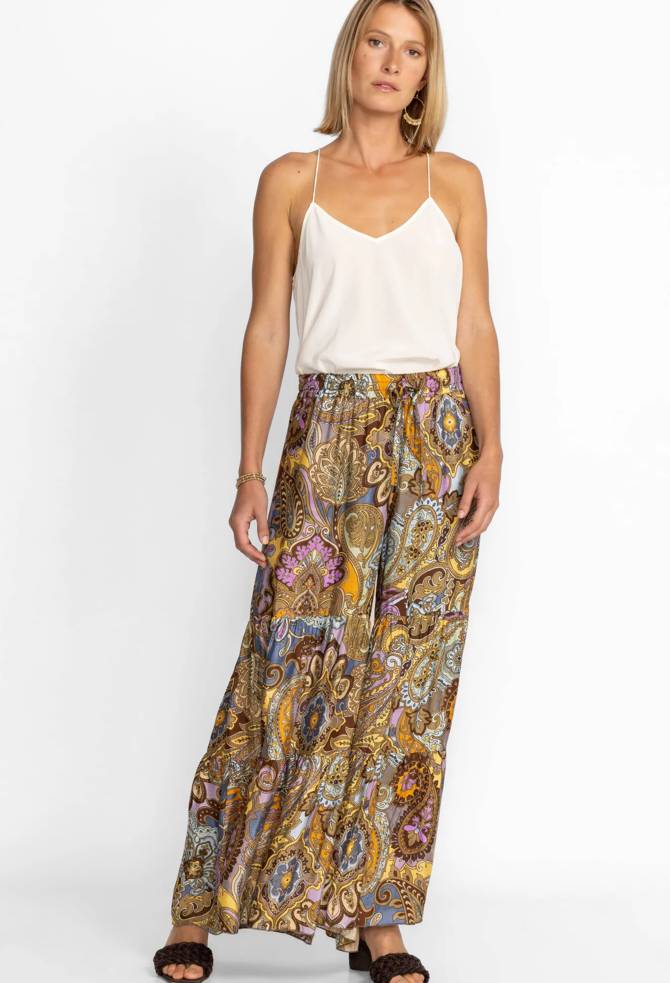Presenting A Rich Color Palette With A Bohemian Flair, The Sandalwood Viola Pant Is A Free-Spirited Take On A Traditional Trouser. Featuring A Tiered Palazzo Style Leg Line And A Casual Merrow Hem Edge, These Pants Offer Freedom From Traditional Silhouettes. Pair With A Fitted Top And Denim Jacket For A Multi-Season Ensemble.