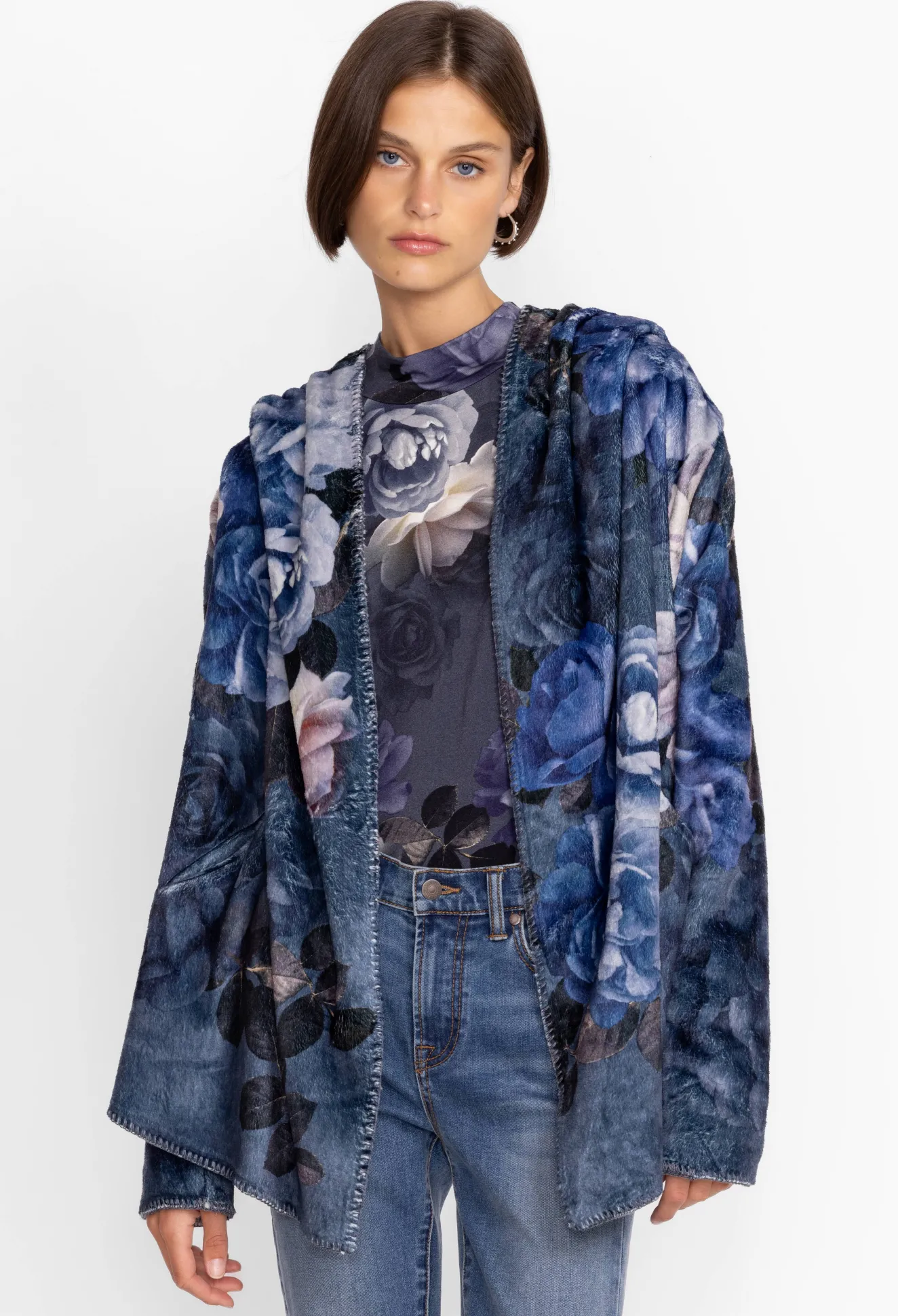 A Vibrant Layer For Cooler Days, The Grey Peony Sherpa Jacket Is Brought To Life Through Arty Details And Unmatched Tactility. Made From A Soft Sherpa Fabric, This Jacket Boasts A Hood, Long Sleeves, An Open Front, Welt Pockets, And Blanket Stitching At The Hem And Sleeves. Style This Jacket With Relaxed Loungewear For An Effortlessly Chic Off-Duty Outfit.
