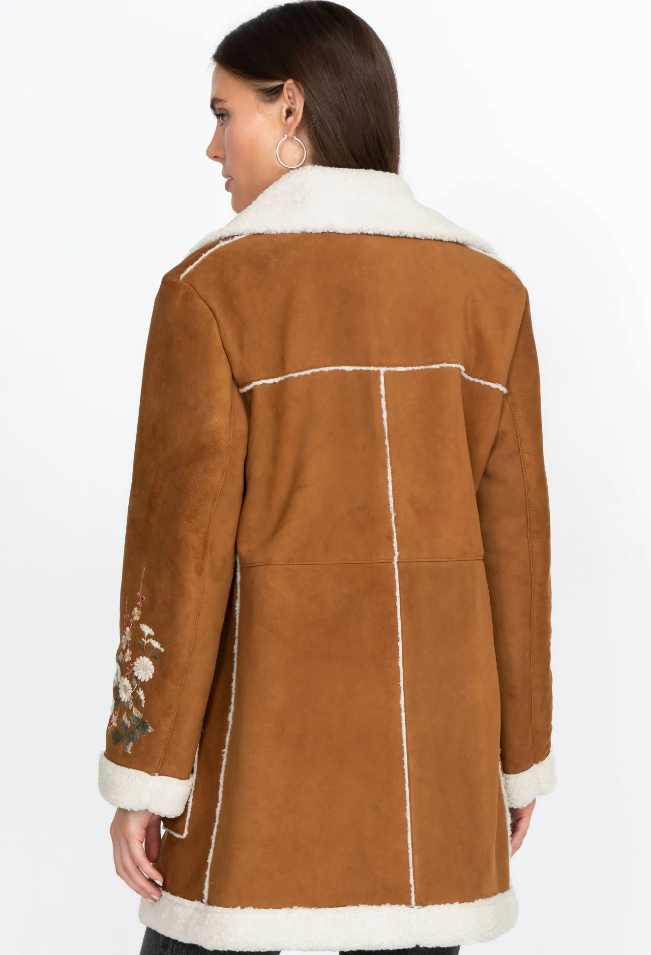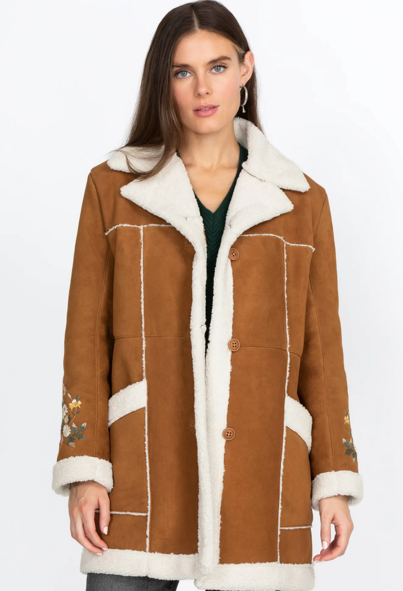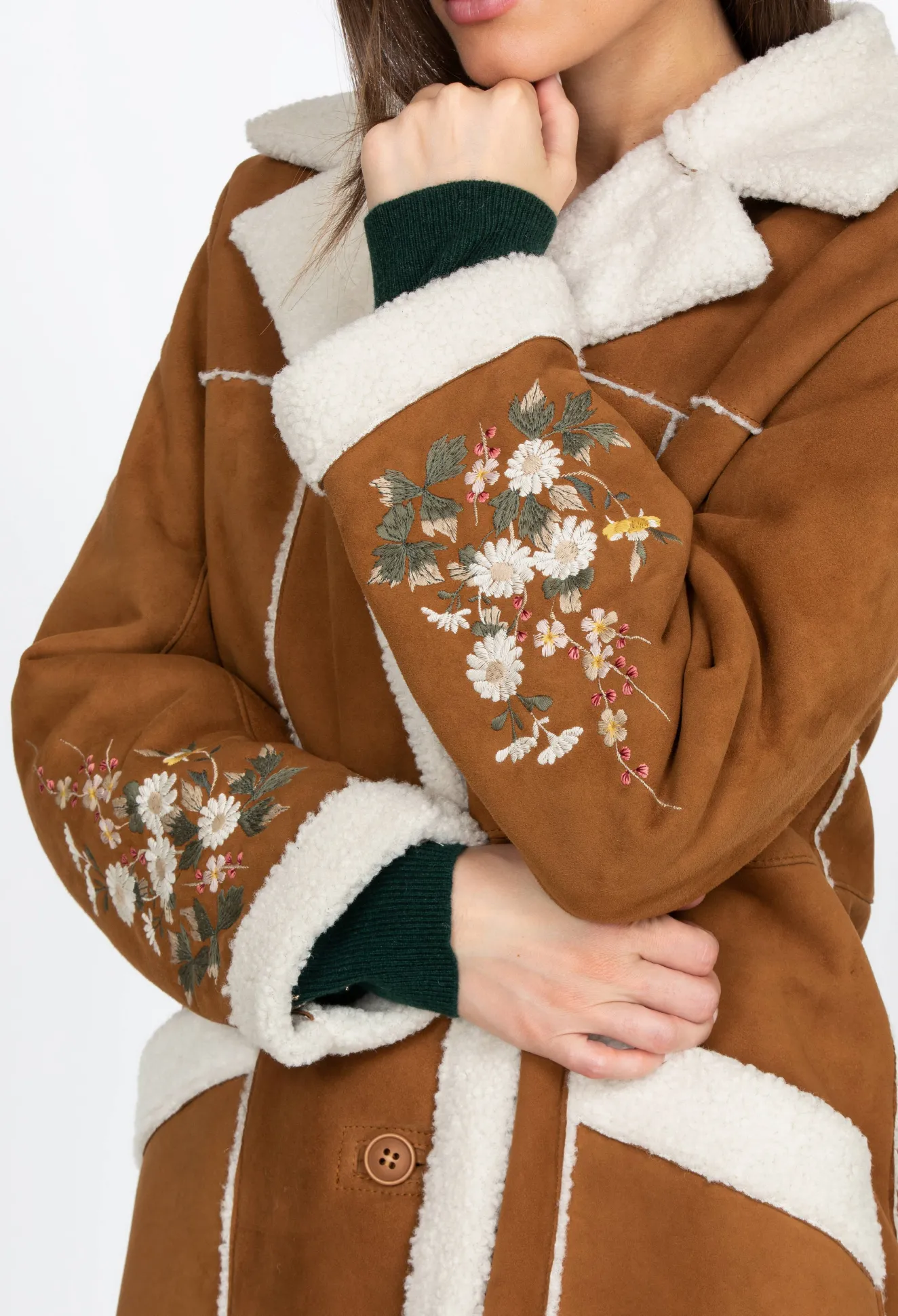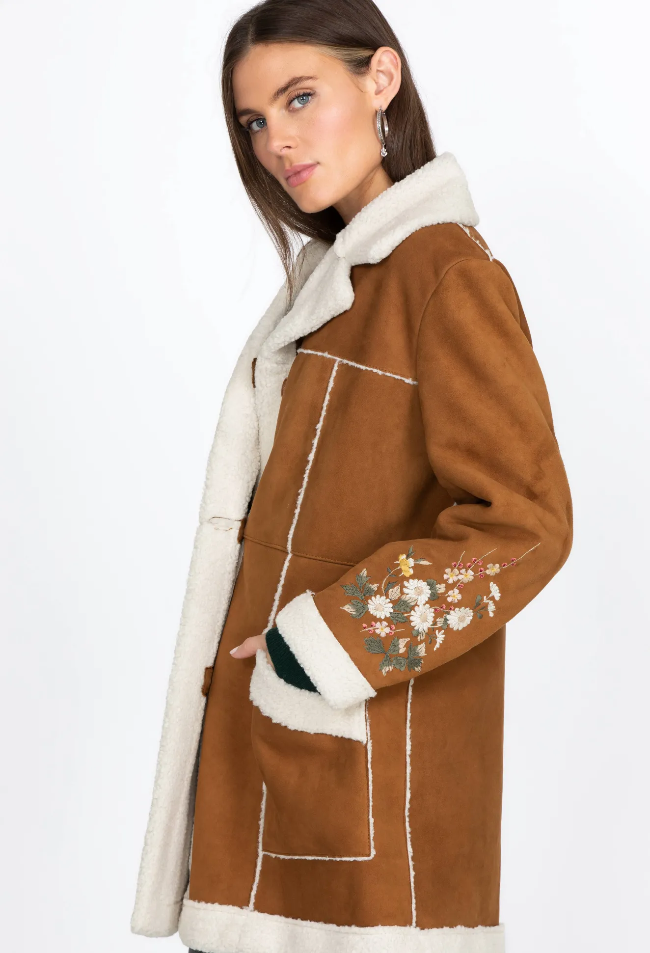 This Gorgeous Sherpa Coat Features Contrasting Hem, Lapel, And Pocket Borders That Bring Out The Rich Hue Of The Suede Material. Soft And Comfortable, This Coat Is A Timeless Classic Embellished By The Floral Embroidery Details On The Sleeves. It S A Stunning Addition To Your Outerwear Collection, And You Can Wear This Versatile Piece With Jeans, Leggings, Or Maxi Skirts.