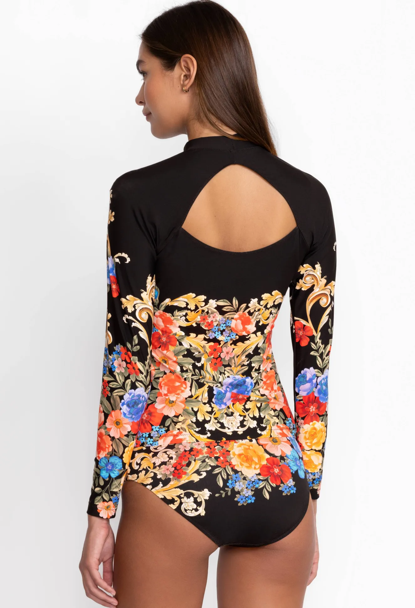 Our Black Royal Cut Out Back Surf Shirt Is The Perfect Piece For Any Sporty Swim Ensemble ?Whether You E Lounging On The Beach Or Out Catching Waves. The On-Trend Floral Print And Colorway Pairs Well With Your Favorite Bottoms ?From The Matching Hipsters To Sleek And Neutral Bikini Bottoms.