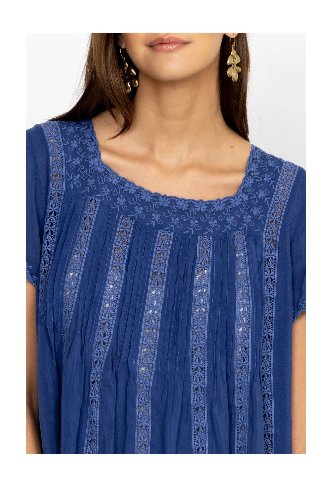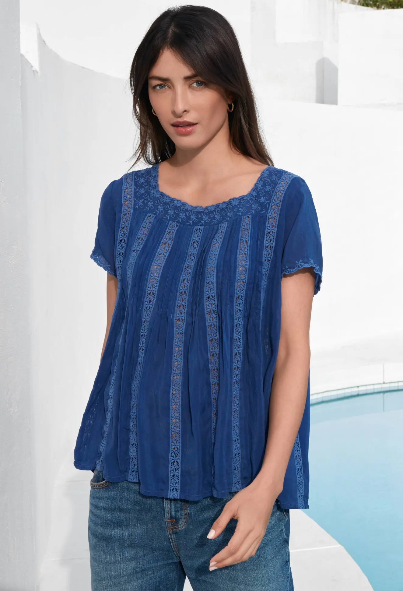 Steeped In Romance, The Brigita Blouse Fuses A Feminine Aesthetic With Delicate Design Details. Cut In A Straight Fit, This Blouse Is Enhanced By Intricate Trims Along The Edges Complete With Matching Vertical Trims And Pleats Through The Body. Keep This Elegant Blouse As The Main Focus By Pairing With Plain Pants Or A Plain Maxi Skirt.