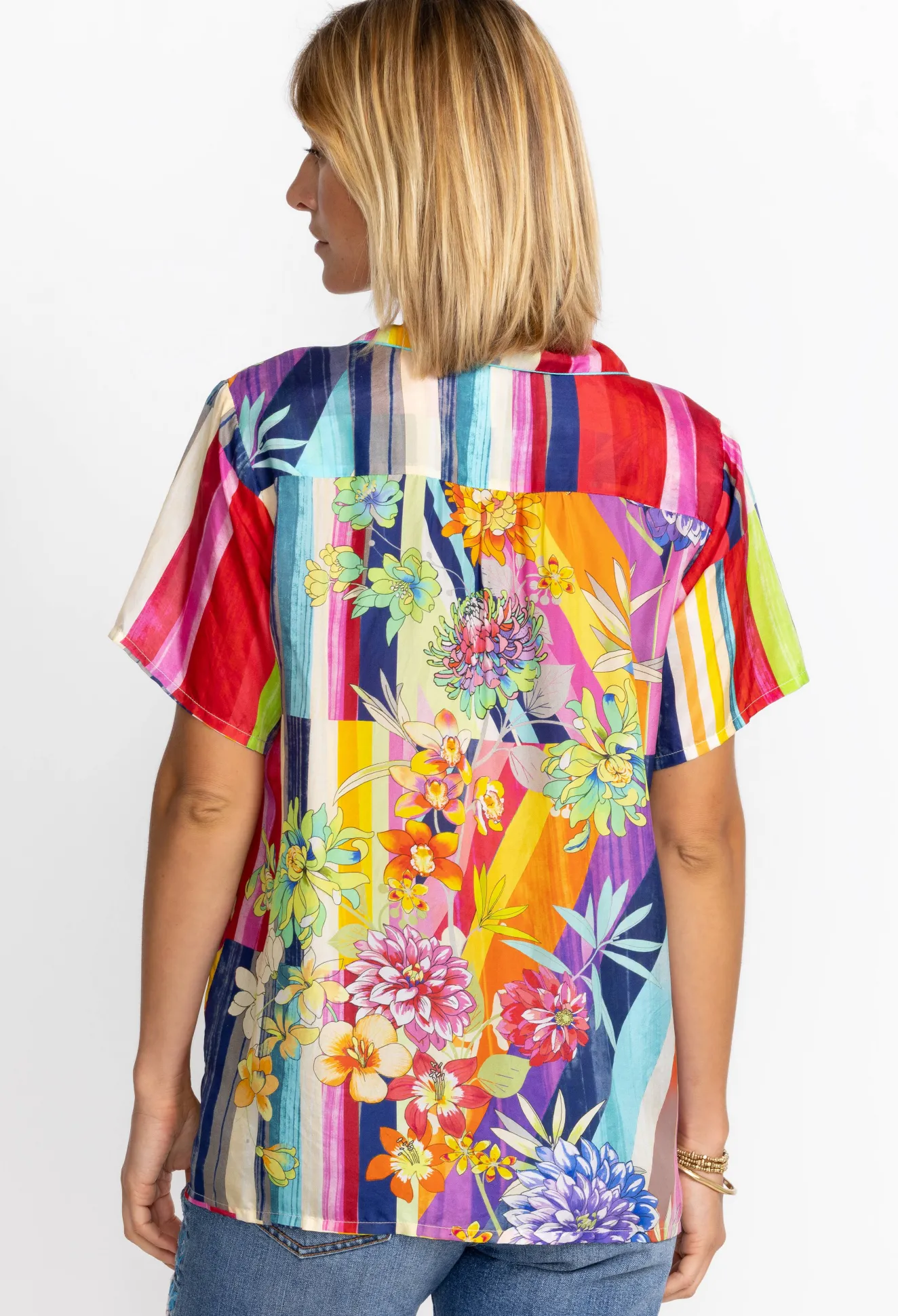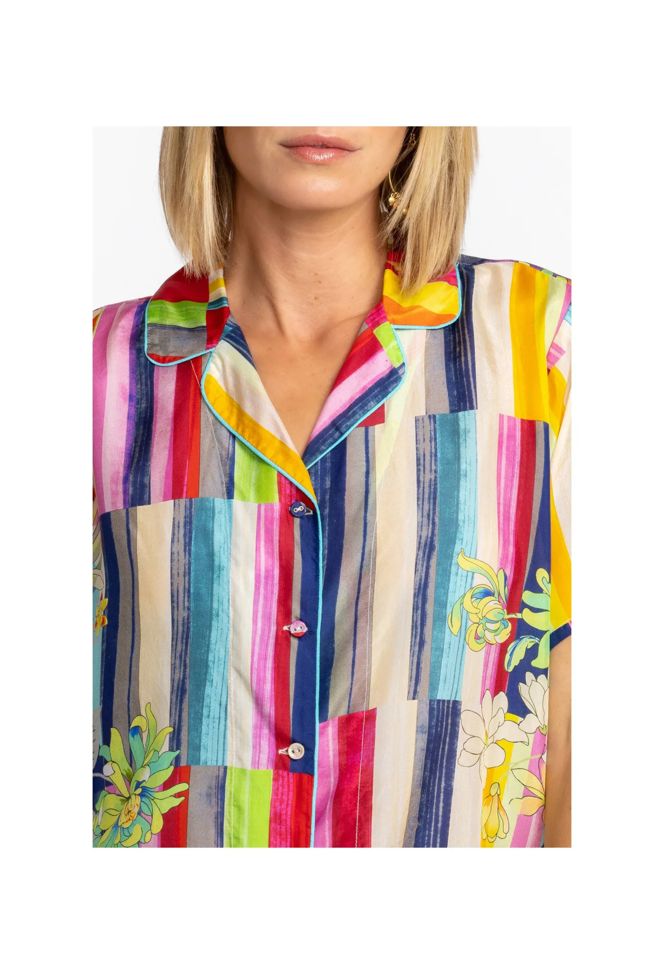 Crafted From 100% Silk, The Summer Stripe Button Up Is A Refreshing Take On A Classic Blouse. Featuring Bold Stripes Paired Seamlessly With Soft Floral Hues, This Lightweight, Flowy Top Is An Elegant Statement Piece. Pair With Your Favorite Jeans Or Wide Leg Pants For A Lively Weekend Look.