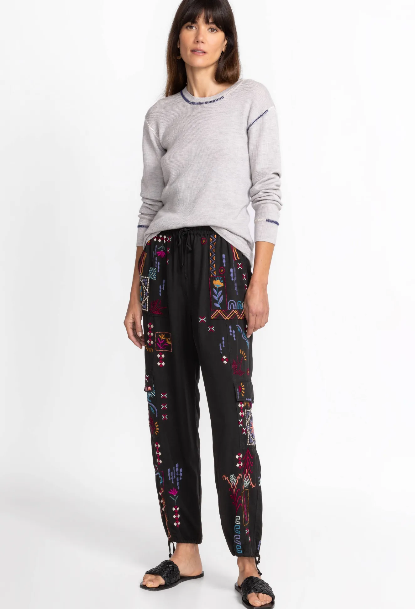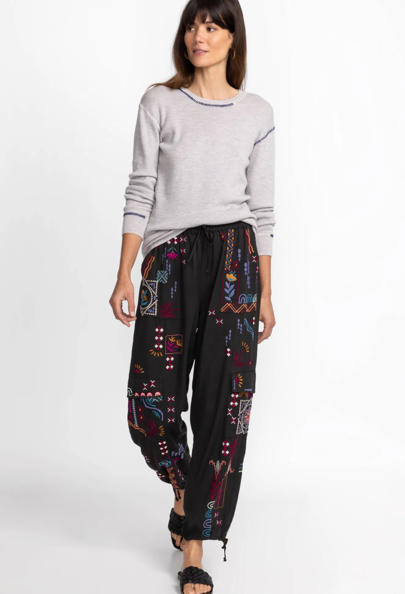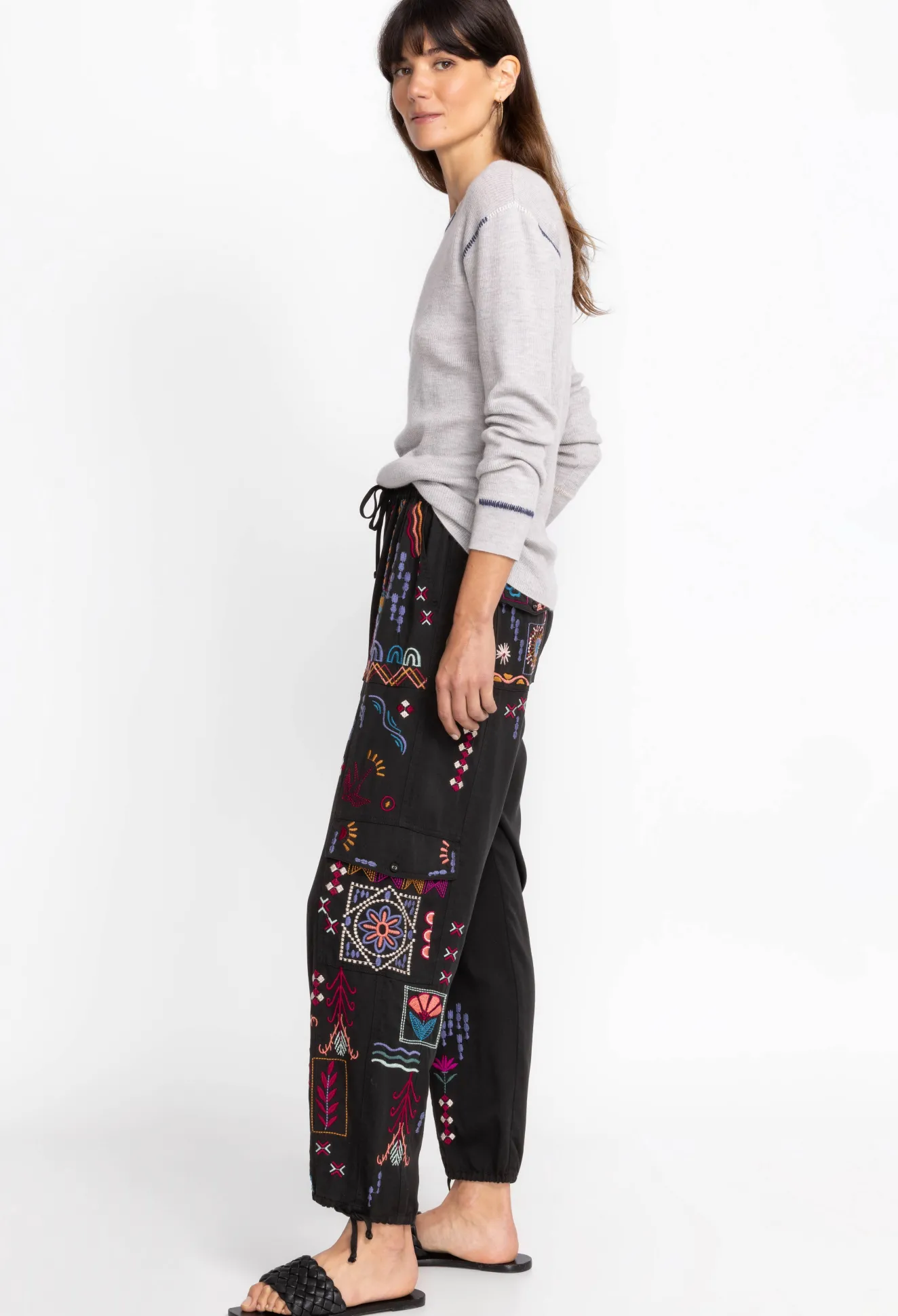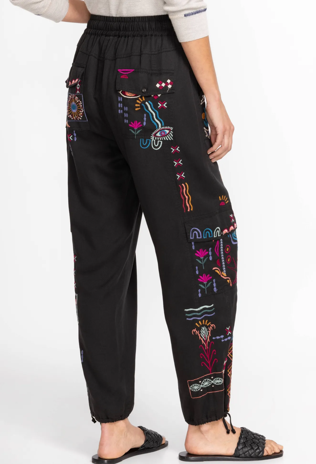 The Campo Drawstring Cargo Pant Adds A Feminine Air To This Classically Masculine Silhouette. Crafted From A Light Flowy Material And Expertly Adorned With Colorful Placement Embroidery, These Cargo Pants Feature An Elastic Waistband With Adjustable Ties At The Waist And Ankles. Pair With A Silk Button Down And Leather Sandals For A Polished Weekend Look.
