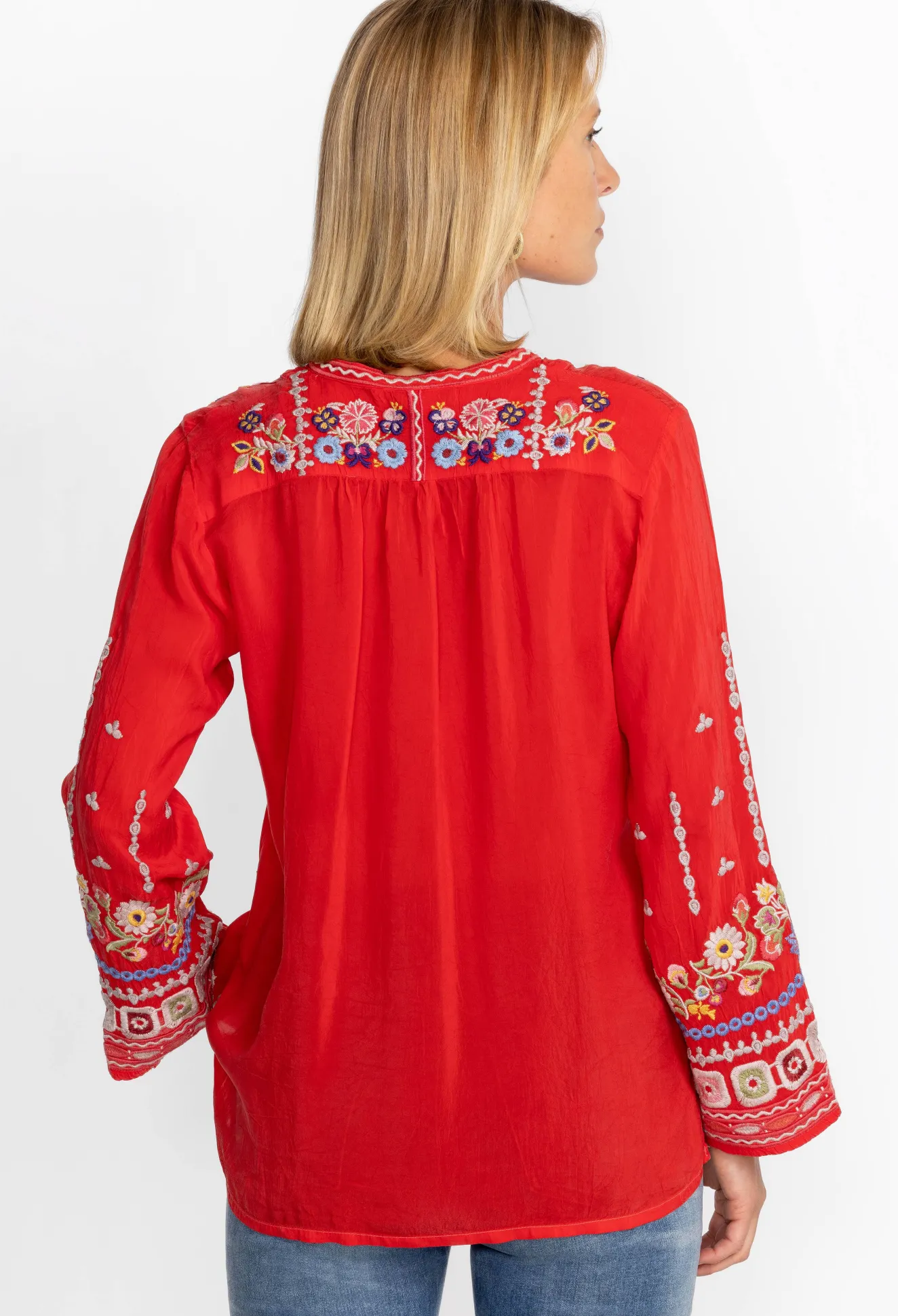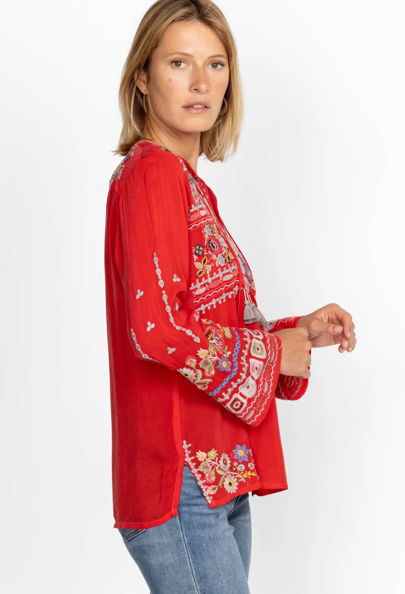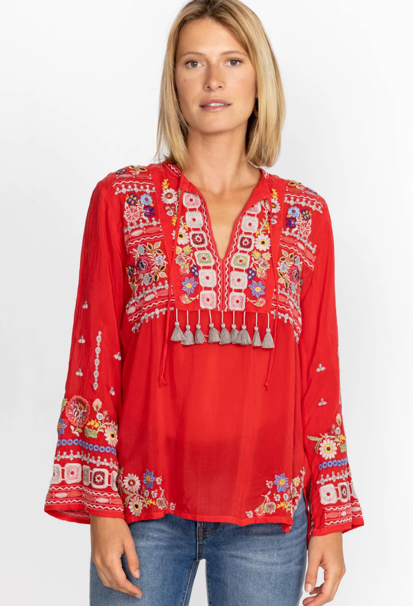 Crafted From A Lightweight Fabric, The Coriander Blouse Is Peppered With Eye-Catching Motifs. A Failsafe Choice For Day-To-Day Pursuits, This Blouse Boasts A Tie At The Neckline With Tassels, Long Sleeves, And A Detailed Placement Embroidery In Rich Shades. Opt For A Bohemian Look By Pairing This Blouse With Neutral Linens And Statement Jewelry.