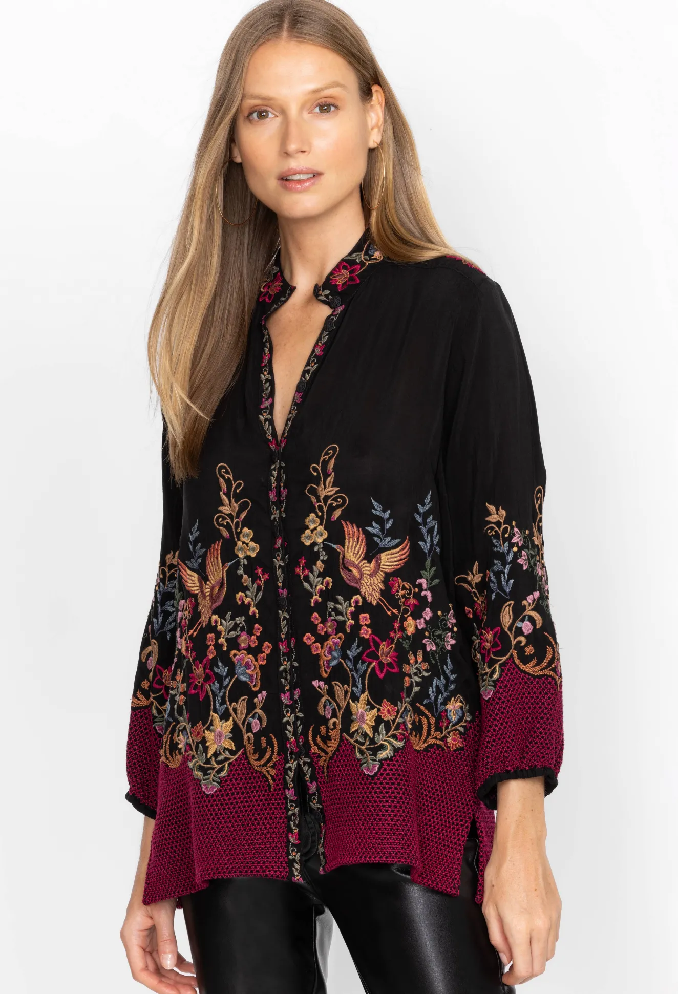 Featuring A Bold Design In An Eye-Catching Silhouette, The Eleana Blouse Offers A Distinctively Modern Cut. This Button-Front Top Boasts A Banded Collar And Elastic Cuffed Sleeves As Well As A Unique Color Block Pattern That Draws Attention To The Intricately Detailed Embroidery. Pair With Sleek Leggings And Ballet Flats For A Retro-Chic Ensemble.