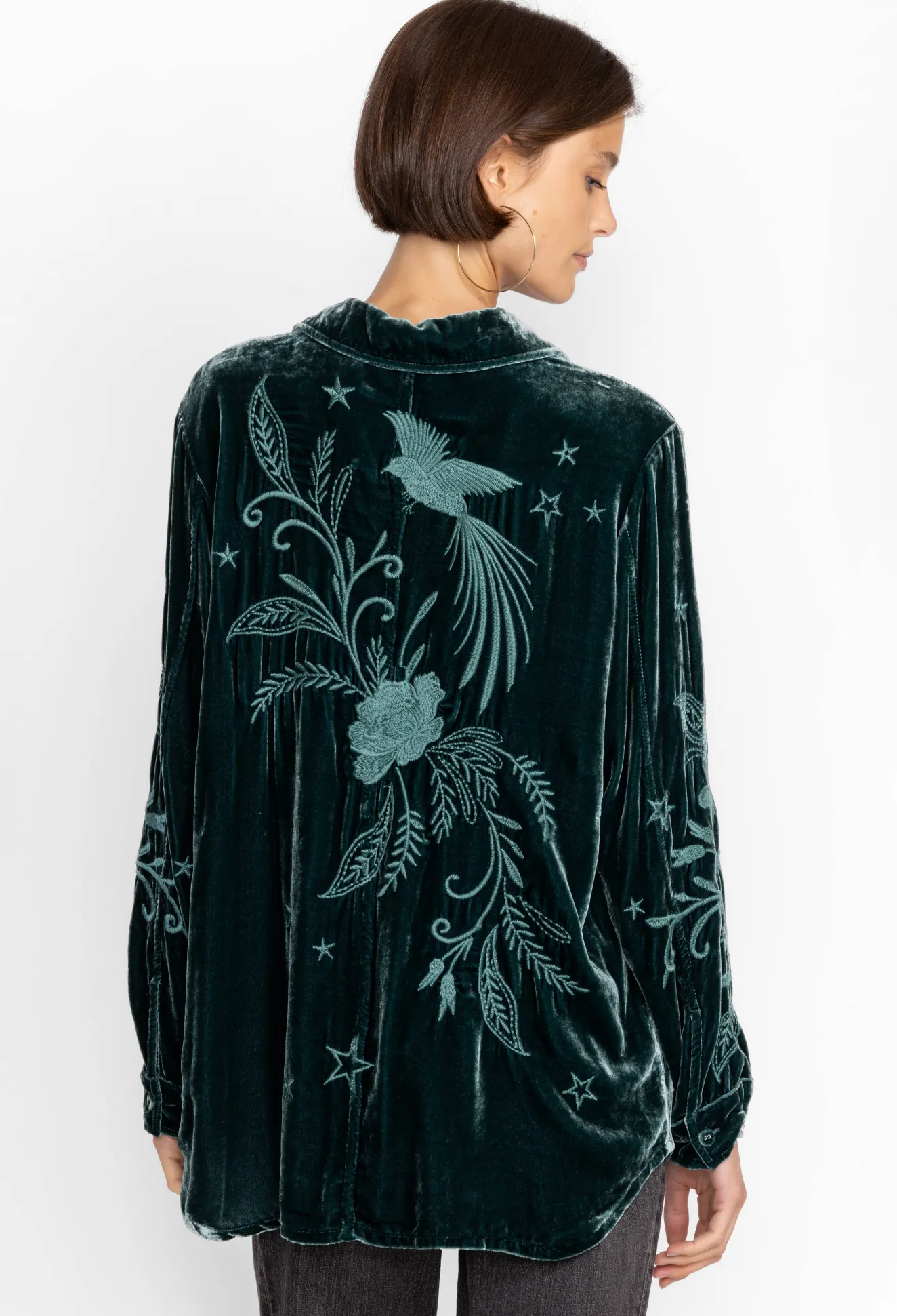Emanating A Vintage Feel, The Frankie Velvet Chore Jacket Demonstrates A Passion For Detail. Imagined In A Green Colorway, This Jacket Is Made From Silk Blend Velvet And Features A Collar, A Front Button Closure, Long Sleeves, Patch Pockets, A Floral Placement Embroidery, And Fabric Covered Buttons. Wear This Jacket With A Tee And Jeans For A Stylish Yet Relaxed Wear-Anywhere Look.