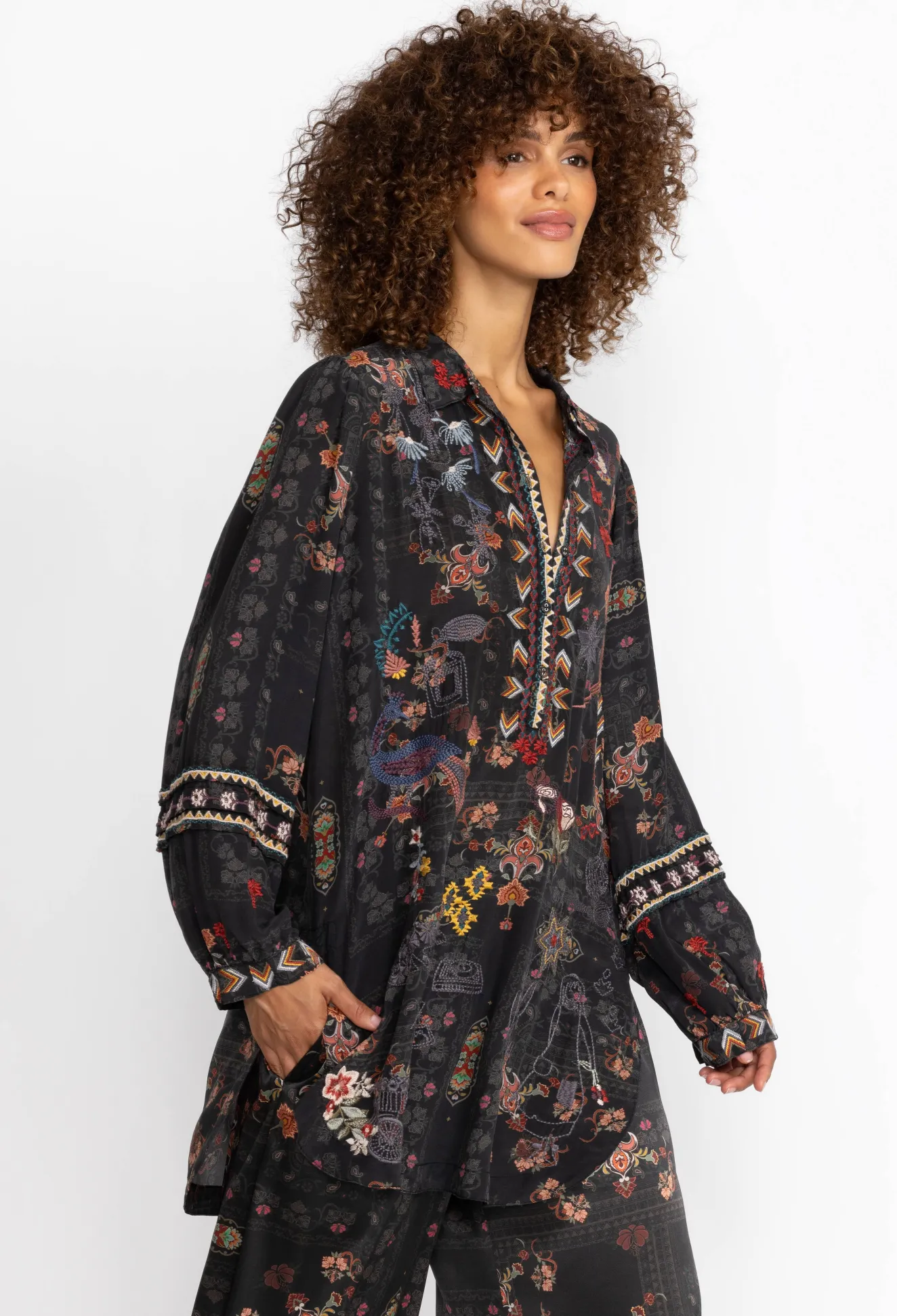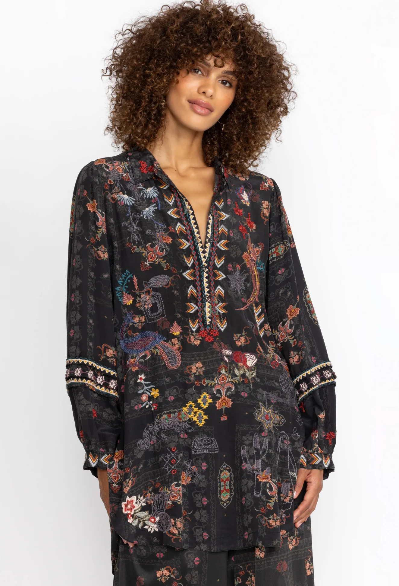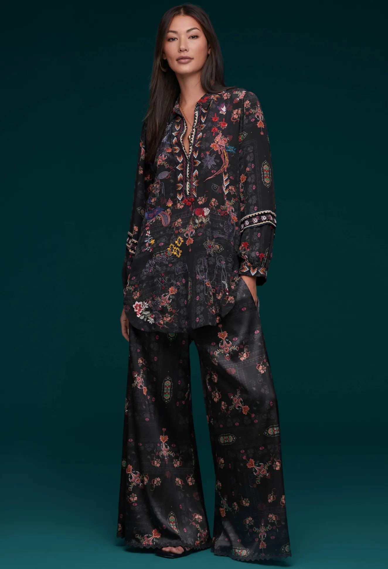 Crafted From 100% Sumptuous Silk, The Aggie Tunic Top Is An Exercise In Intricate Elegance. Ornately Detailed With Bursts Of Brilliant Floral Pattern, This Blouse Features Delicate Placement Embroidery And Carefully Constructed Fabric-Covered Buttons At Both The Front And At The Cuffs. Pair With Flowing Palazzo Pants For A Uniquely Bohemian Flair.