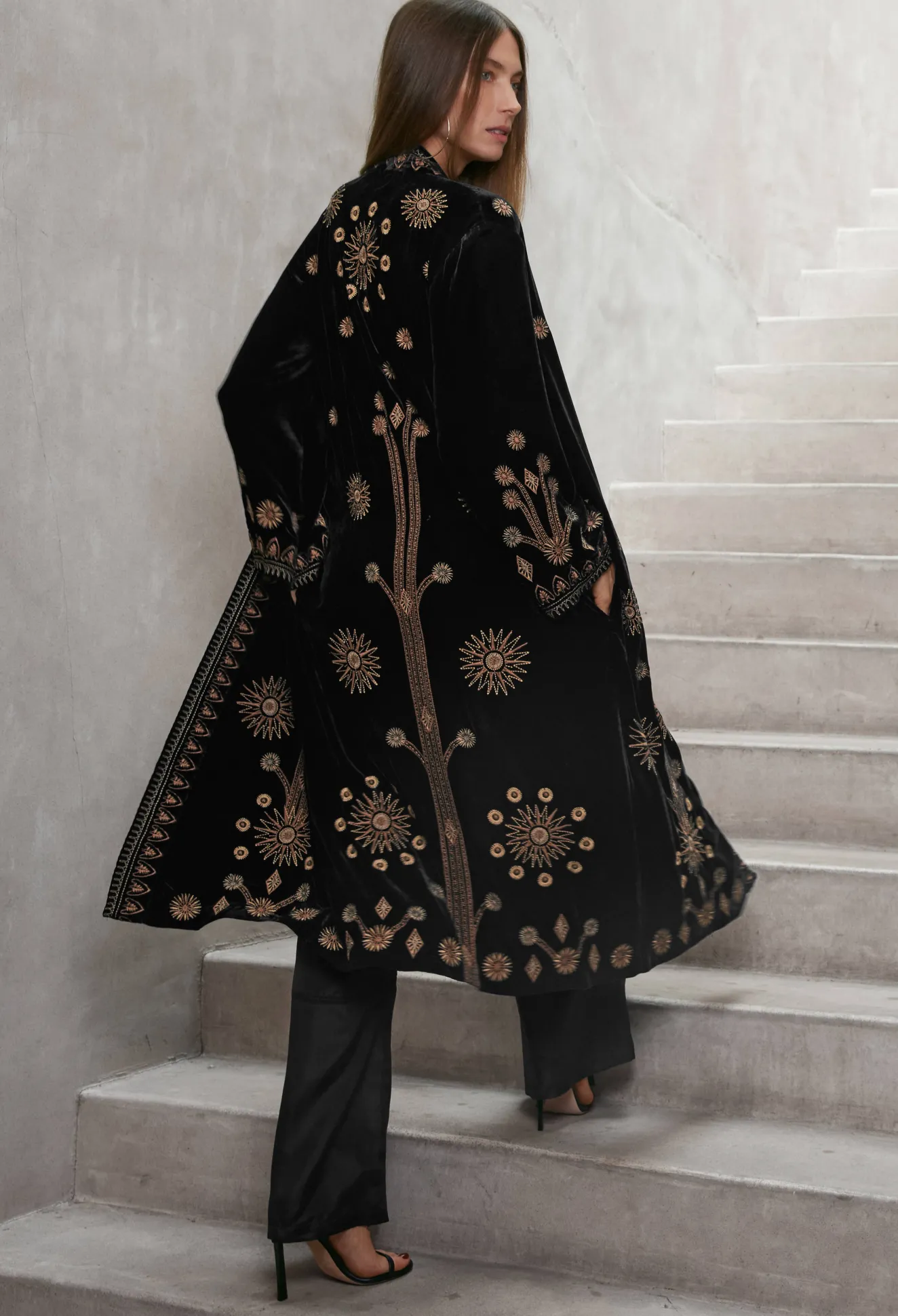 Providing A Luxe Layer For Cooler Days, The Heidi Velvet Kimono Coat Adds Stunning Detail To Any Look. Crafted From A Unique Silk Blend, This Velvety Midi-Length Coat Is Highlighted With Intricate Placement Embroidery. Layer Over A Classic Little Black Dress And Add Sparkling Heels For An Evening Out.