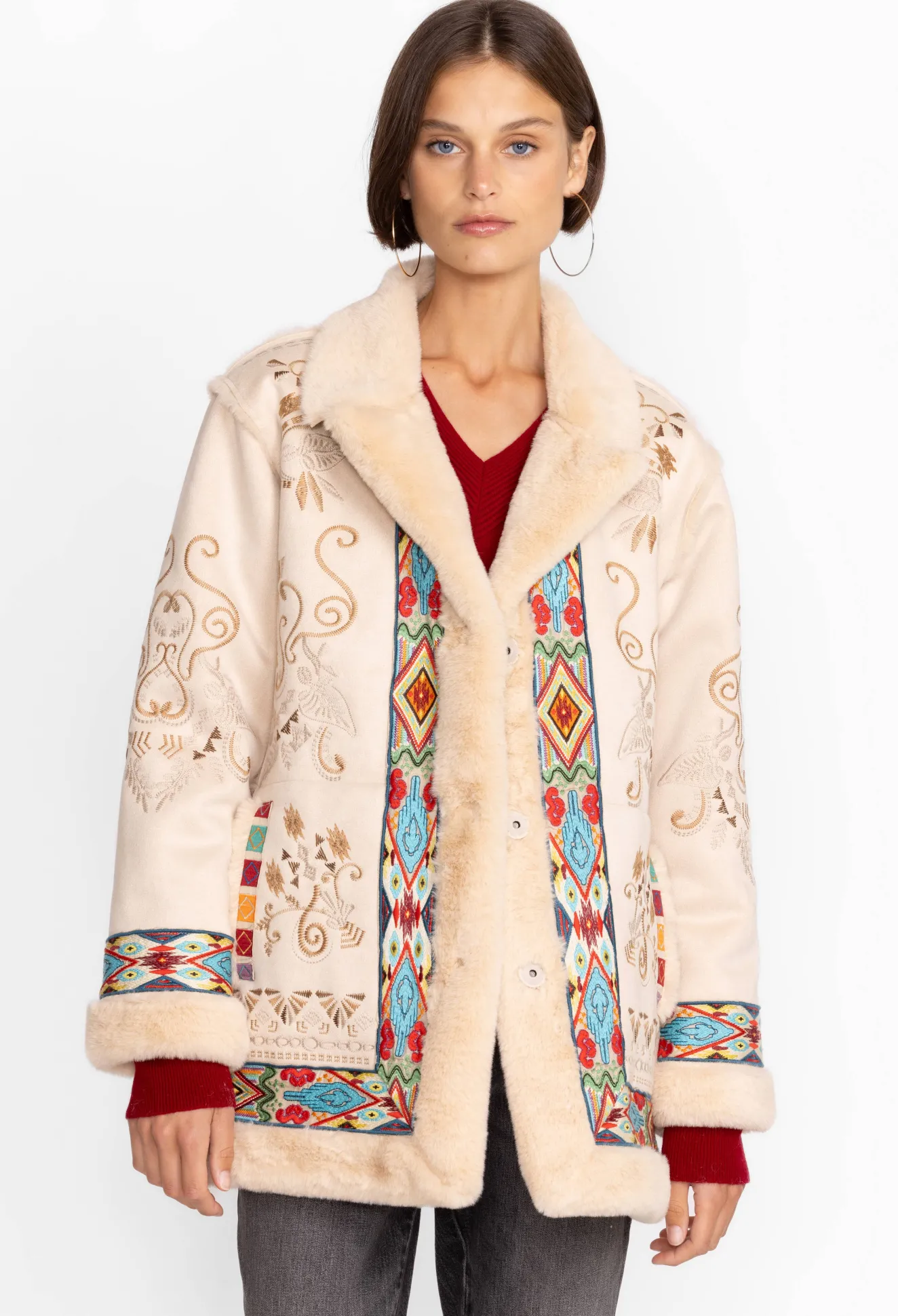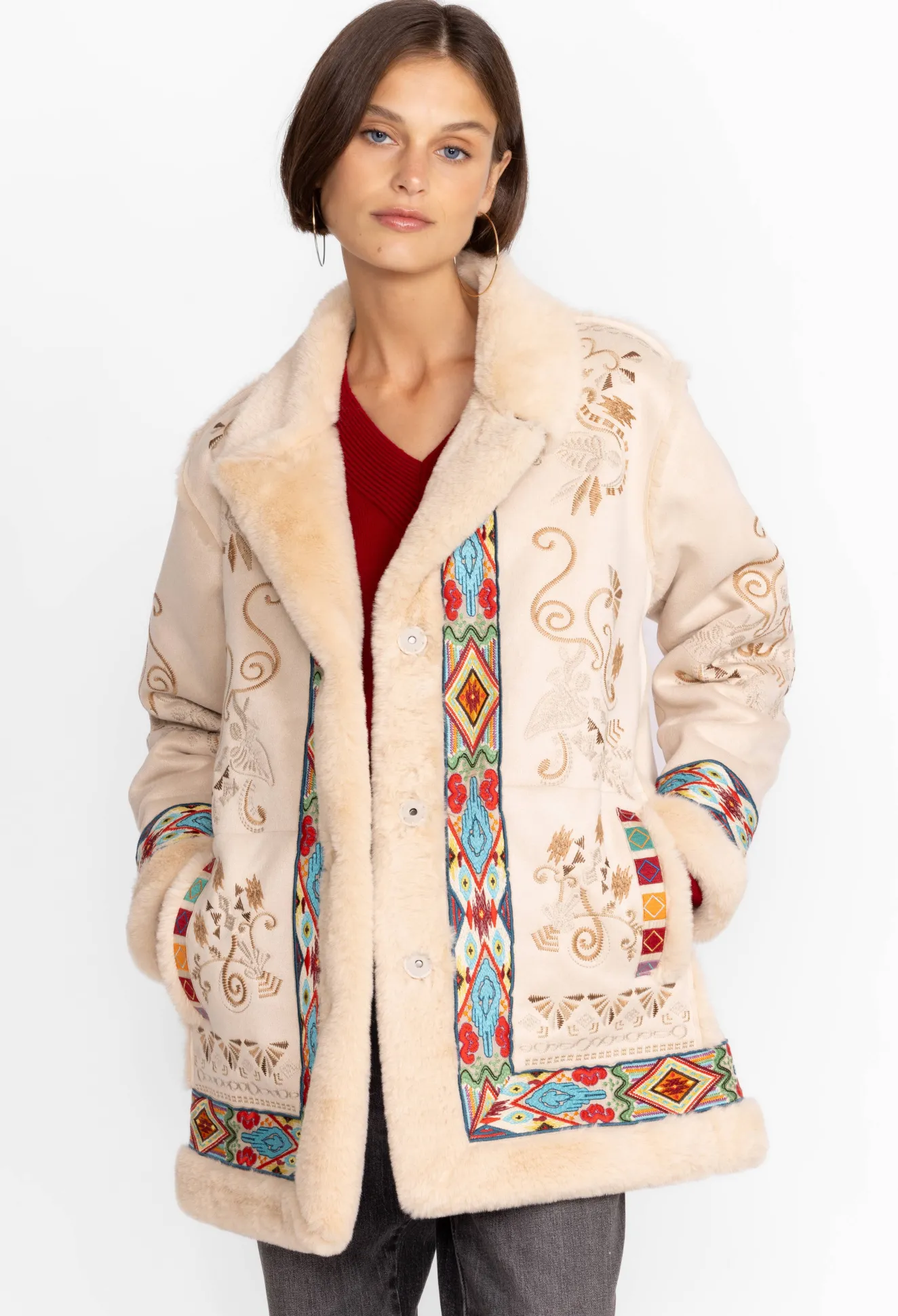 Add A Touch Of Unmatched Style To Apres Ski Activities With The Hepburn Ski Faux Fur Coat. Perfect For Both The Slopes And Evening Activities, This Coat Is Made From Insulating Faux Fur And Features A Fabric Covered Snap Closure, Pockets, A Faux Fur Collar And Trim, And A Detailed Floral Placement Embroidery. Pair With Knitted Pants And A Sweater For A Cozy Cold-Weather Finish.