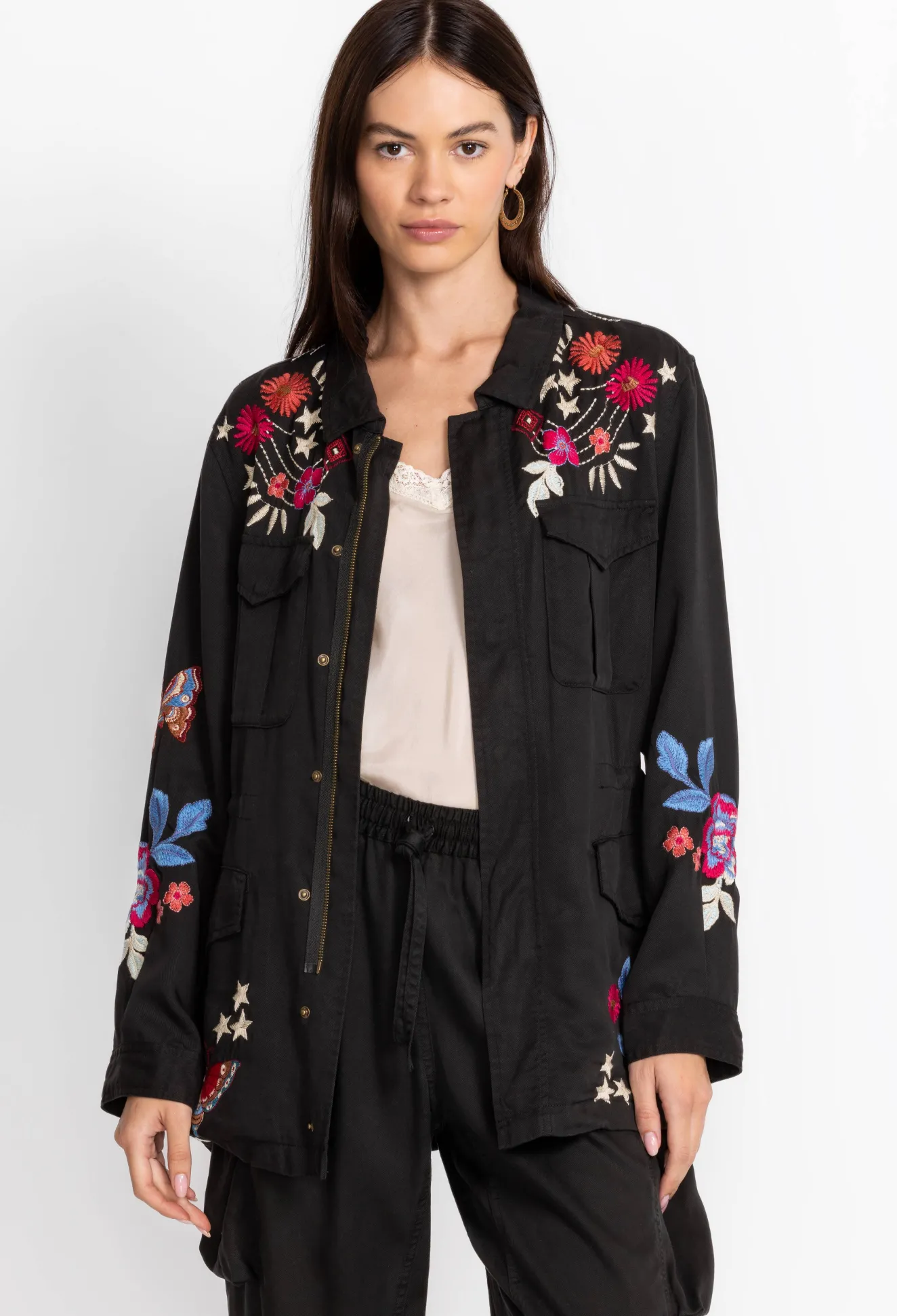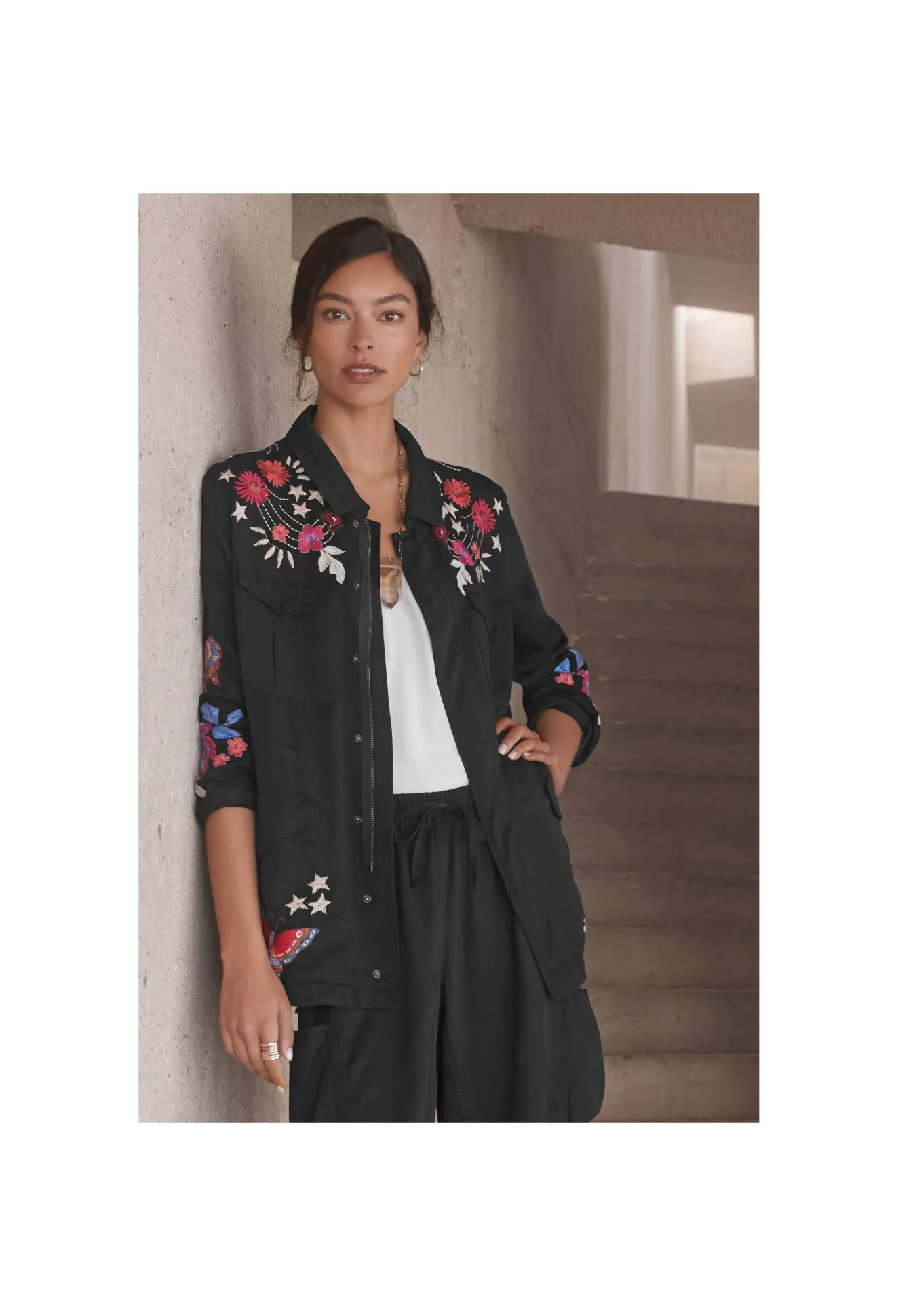 Decorated With Scenic Displays Of Lovely Flora And Fauna In Saturated Color, The Mika Paris Drawstring Military Jacket Adds Vibrancy To Any Look. Taking Inspiration From Traditional Military Jackets, This Structured Layer Includes Delicate Placement Embroidery For A Feminine Touch. Pair With Bold Pants, A White Tee, And Combat Boots For A Bold Casual Look.