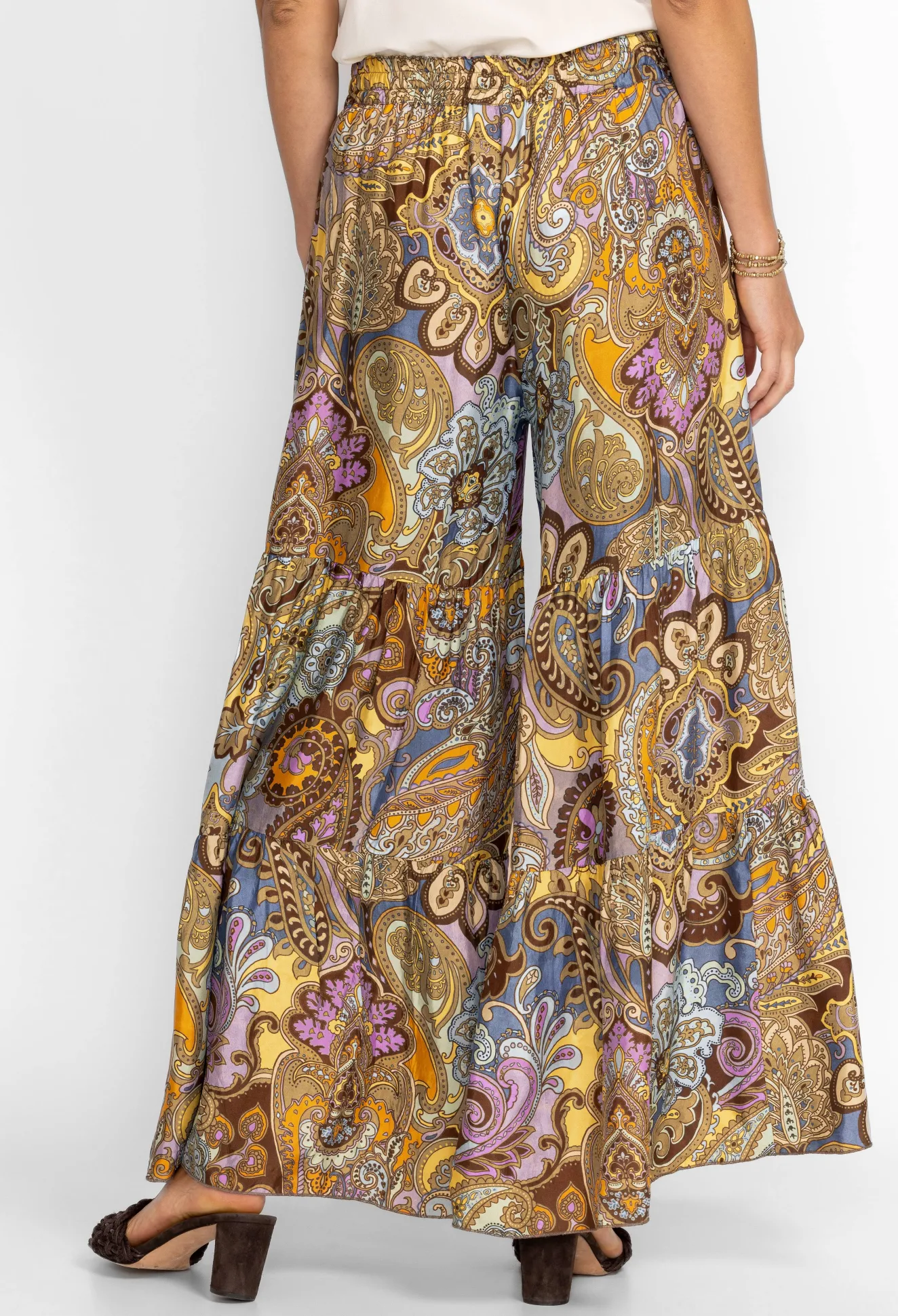 Presenting A Rich Color Palette With A Bohemian Flair, The Sandalwood Viola Pant Is A Free-Spirited Take On A Traditional Trouser. Featuring A Tiered Palazzo Style Leg Line And A Casual Merrow Hem Edge, These Pants Offer Freedom From Traditional Silhouettes. Pair With A Fitted Top And Denim Jacket For A Multi-Season Ensemble.