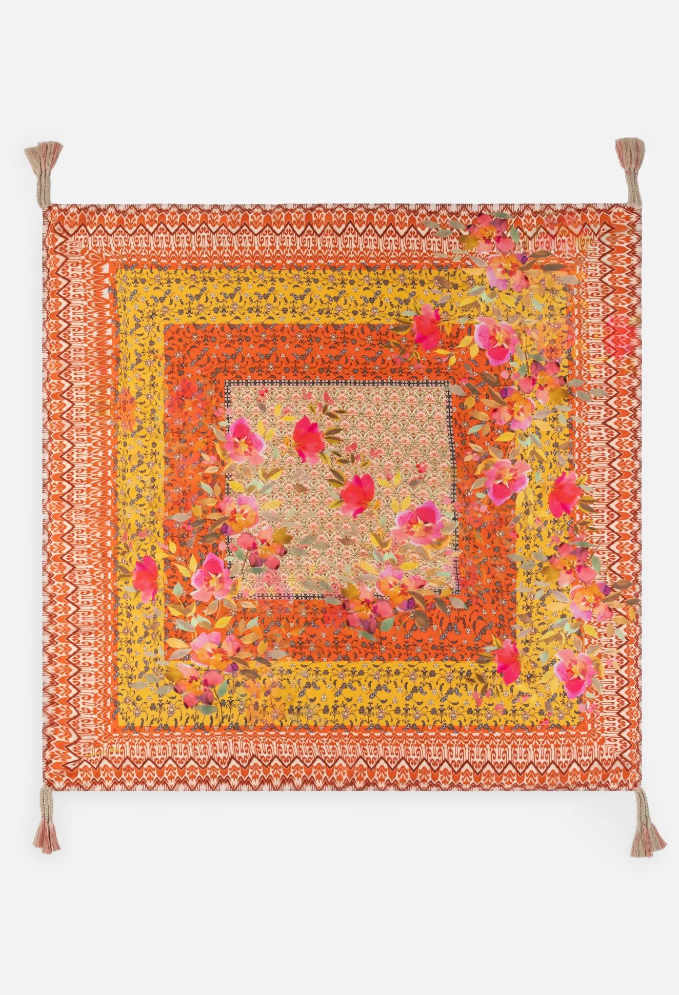 Conjuring Images Of A Sweet-Scented Garden, The Eliana Scarf Filters A Classic Design Through A Romantic Lens. This Scarf Is Designed From Liquid-Like Silk With Tassels And Is Further Characterized By A Border Print And A Saturated Floral-Patterned Overlay. Tie This Scarf Around The Neck And Style With A Midi Dress For A Glamorous Warm-Weather Look.