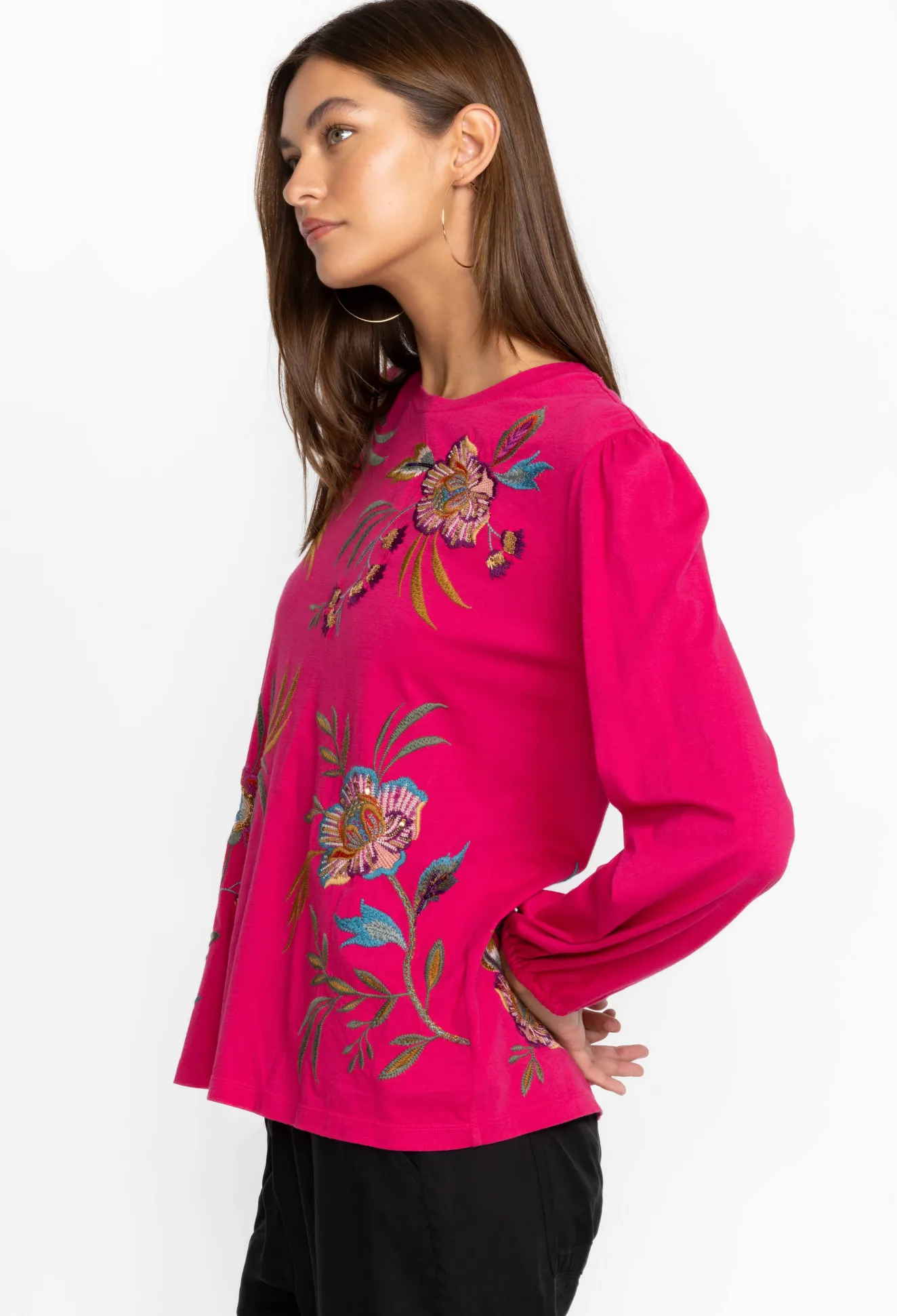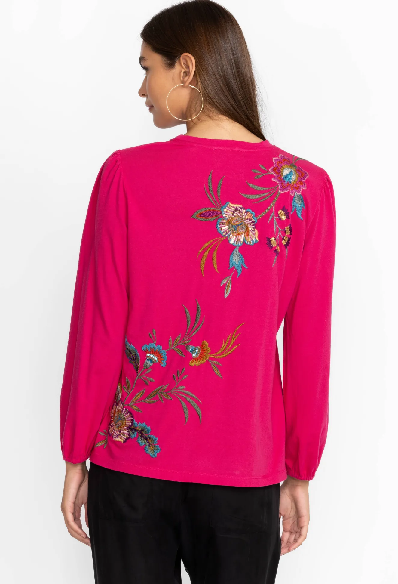 Made From Soft Cotton, The Sidonia Bishop Sleeve Sequin Tee Evokes Feelings Of Romance. A Femme Choice For Day-To-Night Transitions, This Tee Features A Round Neck, Elastic Sleeve Cuffs, A Pretty Floral Placement Embroidery With Sequins, And Bishop Sleeves For A Dramatic Finish. Style This Tee With Wide-Leg Pants For A Laid-Back Yet Elegant New Season Ensemble.