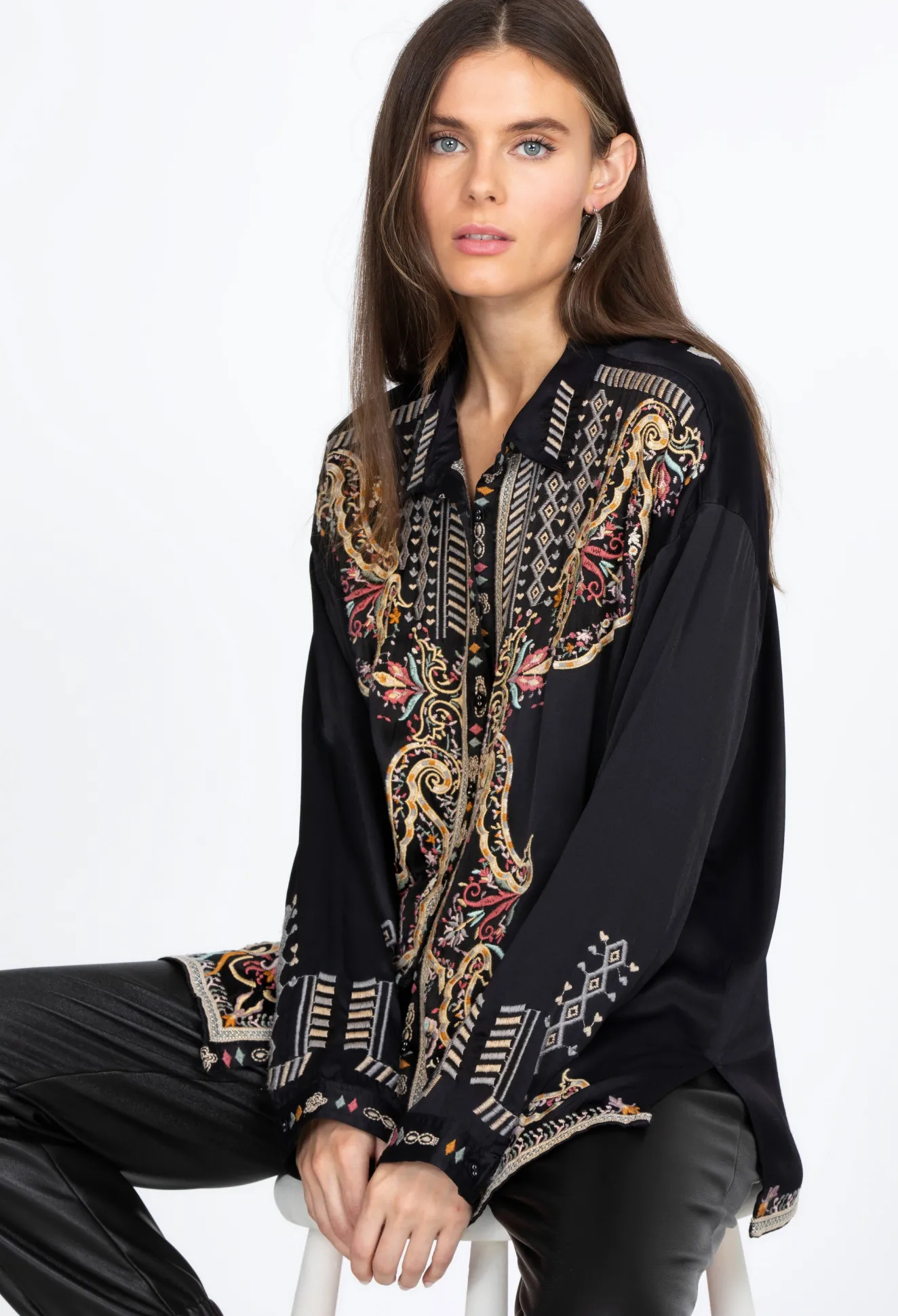 Our Tandit Blouse Caresses The Skin With Its Loose, Flowing Satin. White, Geometric Finishes With Delicate Embroidered Flowers Grace The Front, Collar And Sleeves. Choose The Tandit In Black Or Spruce Green, And Pair It With Black Velvet Pants And Black Ballet Slippers For A Cohesive Look. You Could Also Select A Black Pencil Skirt And Heels To Contrast With The Tandit S Subtle Lines.