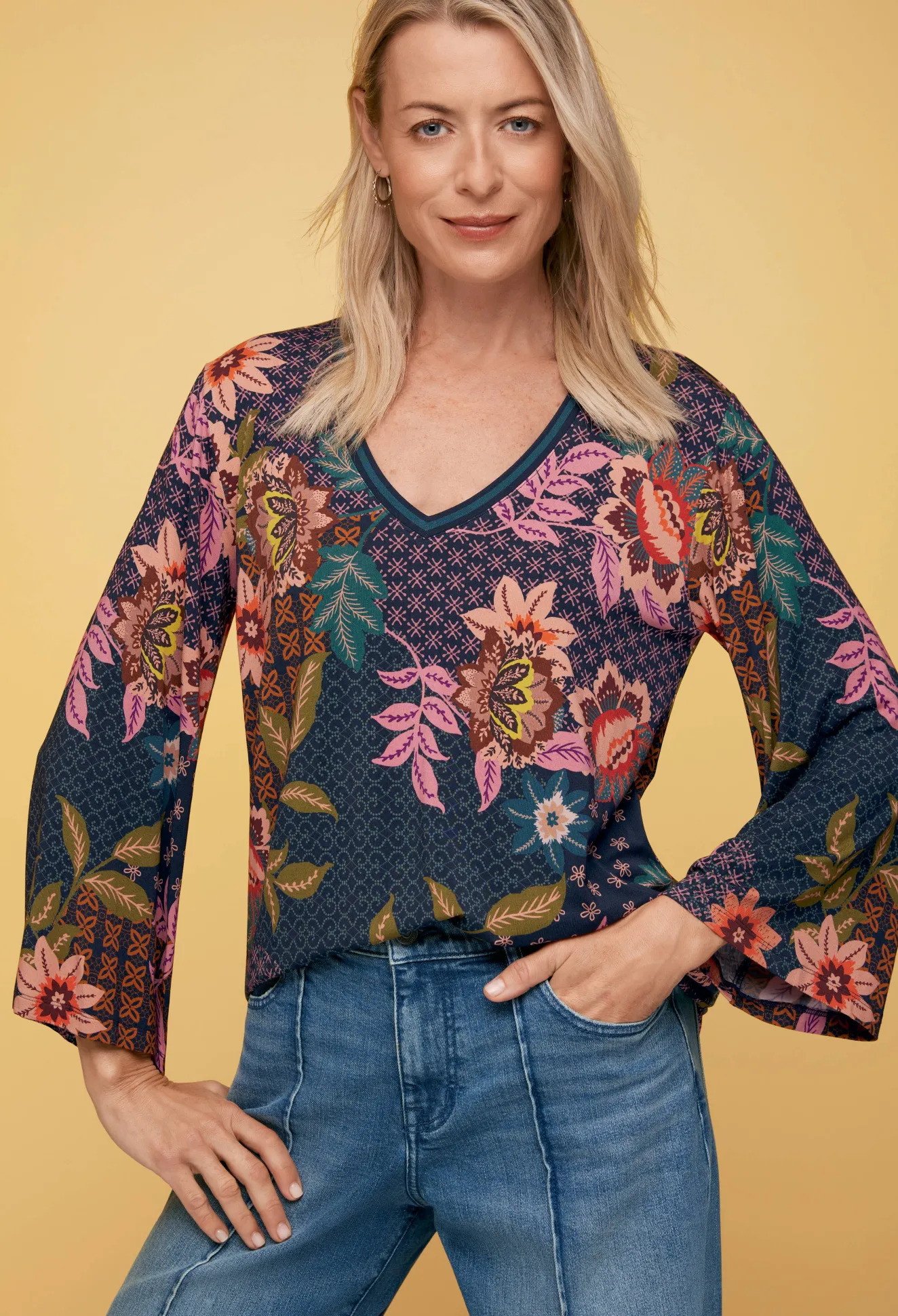 Emboldened With Vivid Floral Bouquets, The Delfino V-Neck Kimono Sleeve Tee Offers An Easy Upgrade To The Typical Casual…