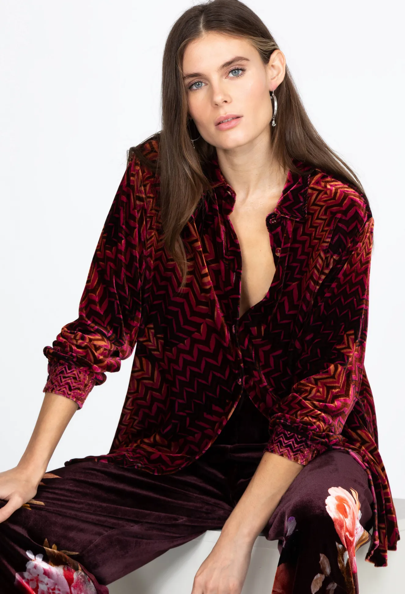 The Belle Velvet Oversized Shirt Is A Stylish Piece To Add To Any Closet. The Sleeve Cuffs’ Shell Buttons And Embroidery Details Create A Modern Twist On This Fashion Staple. Pair It With A Black Jacket And Fitted Jeans For The Perfect Going-Out Fit.