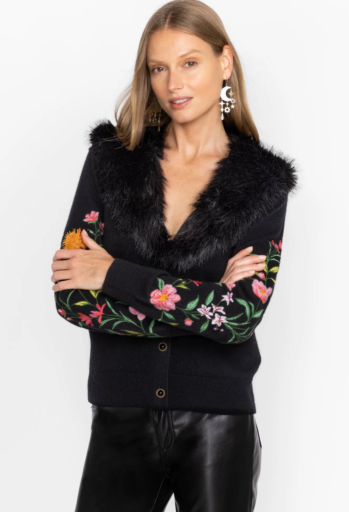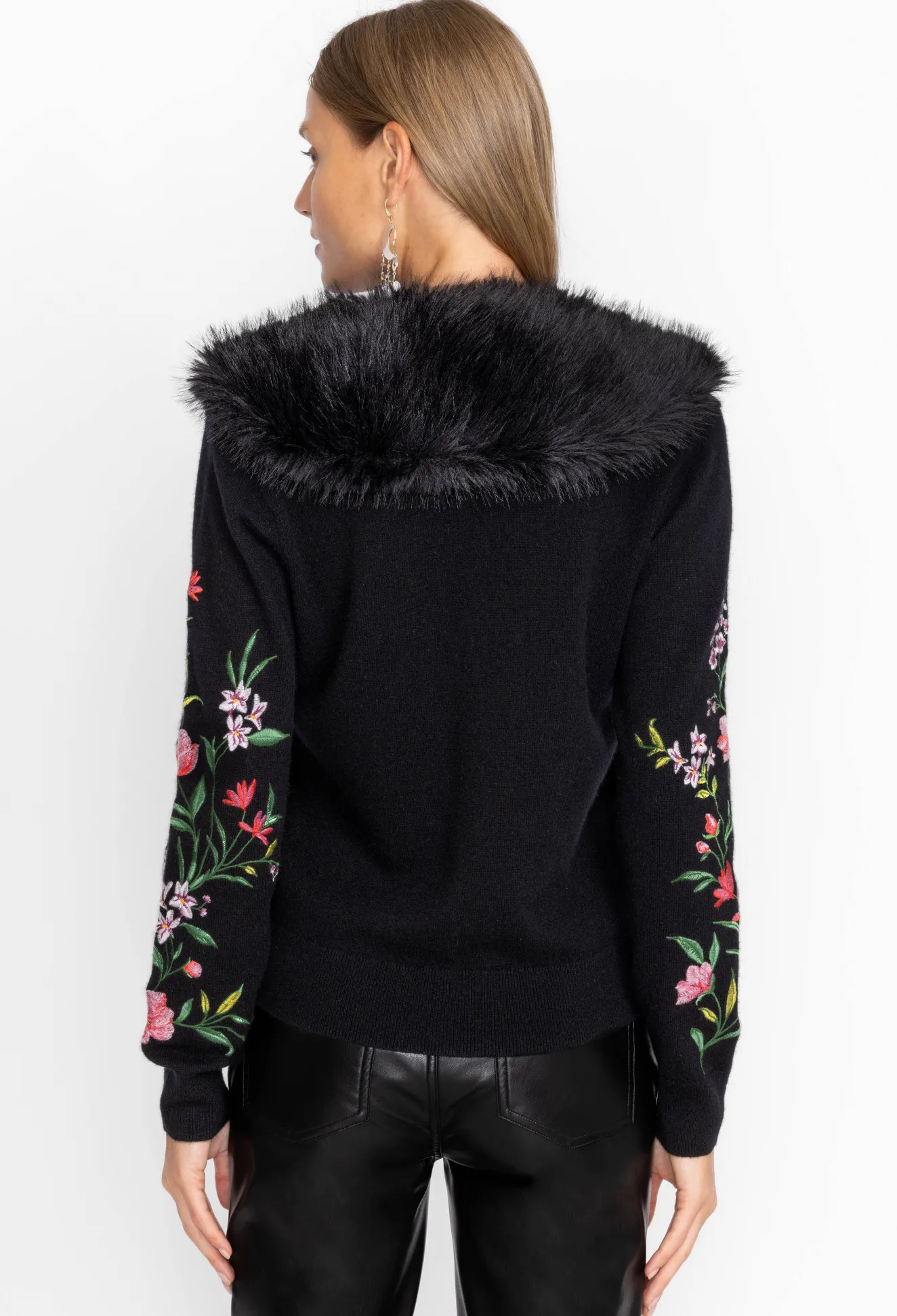 Designed From A Cozy Wool Cashmere Blend, The Vista Faux Fur Collar Cardigan Reworks A Functional Layer Into A Bold Statement Piece. Imagined In Black, This Cardigan Features A Button Front, Welt Pockets, A Lavish Faux Fur Collar, And Floral Embroidered Sleeves For A Femme Finish. Wear This Cardigan With Jeans During The Week And Dress Up With Silk Separates At The Weekend.